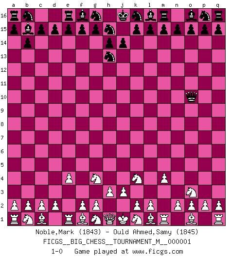 Last move : 1-0 2008 October 31 19:20:57 [Event "FICGS__BIG_CHESS__TOURNAMENT_M__000001"] [Site "FICGS"] [Date "2008.09.18"] [Round "1"] [White "Noble,Mark"] [Black "Ould Ahmed,Samy"] [Result "1-0"] [WhiteElo "1843"] [BlackElo "1845"] 1.j2-k4 j15-h13 2.h2-g4 h16-o10 3.m2-m4 b15-b14 4.e2-e4 c16-b15 5.p1-o3 1-0 This big chess game has been lost on time (started : 2008.09.18 12:51:42) Follow this game move after move (download)It was clear to me that the vulnerable point of the American Grandmaster (Bobby Fischer) was in double-edged, hanging, irrational positions, where he often failed to find a win even in a won position. (Efim Geller) Es ist schade, dass viele Schachsportler vergessen, wie wichtig Auftreten und angemessene Kleidung sind. (Alexandra Kosteniuk) El sobresalir en el Ajedrez es un signo de una mente intrigante. (Sir Arthur Conan Doyle) D'abord les bases : Jouez et étudiez, puis étudiez et jouez, ensuite jouez et étudiez, puis étudiez et jouez. Deuxièmement : Donnez toujours le meilleur de vous-même ! (Ken Smith) Treat your password like your toothbrush. Don't let anybody else use it, and get a new one every six months. (Clifford Stoll)