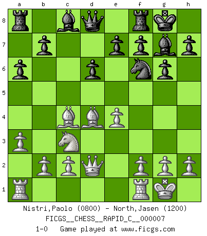 Last move : 1-0 2006 October 10 5:49:31 [Event "FICGS__CHESS__RAPID_C__000007"] [Site "FICGS"] [Date "2006.08.12"] [Round "1"] [White "Nistri,Paolo"] [Black "North,Jasen"] [Result "1-0"] [WhiteElo "0800"] [BlackElo "1200"] 1.Nf3 c5 2.e4 d6 3.Nc3 Nf6 4.Bc4 Nc6 5.O-O g6 6.d4 Bg7 7.Be3 cxd4 8.Nxd4 O-O 9.Qd2 a6 10.a3 Nxd4 11.Bxd4 1-0 This chess game has been lost on time (started : 2006.08.12 9:4:43) Reti Opening Kingside Castling by player White (move 5) Kingside Castling by player Black (move 8) Player White won this chess game. Follow this game move after move (download)Chess is a terrific way for kids to build self image and self esteem. (Saudin Robovic) Wir können eben der zündenden Macht des Opfers nicht wiederstehen, denn die Begeisterung für das Opfer liegt in der Natur des Menschen. (Rudolf Spielmann) Cualquier cambio de material en una posición debe venir por medio de un mate, una captura o promoción de Peón. (Purdy) Les écrivains ont utilisé les échecs pour analyser les côtés extrêmes de la nature humaine. Dans ce cadre, les échecs offrent un champ d'expérimentation idéal. Mais on pourrait faire la même chose avec la peinture. Et là, en vous référant à Van Gogh, vous ne tirerez pas de conclusion définitive sur les peintres. (Gary Kasparov) Chess is as much a mystery as women. (Purdy)