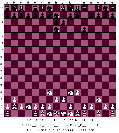Last move : 1-0 2008 October 3 16:37:40 [Event "FICGS__BIG_CHESS__TOURNAMENT_M__000001"] [Site "FICGS"] [Date "2008.09.18"] [Round "1"] [White "Collette,Benjamin"] [Black "Taylor,William"] [Result "1-0"] [WhiteElo ""] [BlackElo "1923"] 1.j2-k4 m15-m13 2.b2-b3 j15-h13 3.c1-b2 h16-o10 4.h2-g4 o10-o2 5.p1-o3 o2-j7 6.l2-l4 j7-d2 7.b1-d2 1-0 Follow this game move after move (download)Don't even mention losing to me. I can't stand to think of it. (Bobby Fischer) Ich verachte Kasparow. (Viktor Kortschnoi) Con o sin el título, Bobby Fischer fue sin lugar a dudas el mas grande jugador de su época. (Burt Hochberg) Ce qui caractérise les parties de combat, c'est que si le défenseur a constamment de difficiles problèmes à résoudre, l'attaquant doit chercher sans relâche de nouvelles possibilités d'attaque. (Koblentz) The next best thing to gambling and winning is gambling and loosing. (Nick Dandalos)