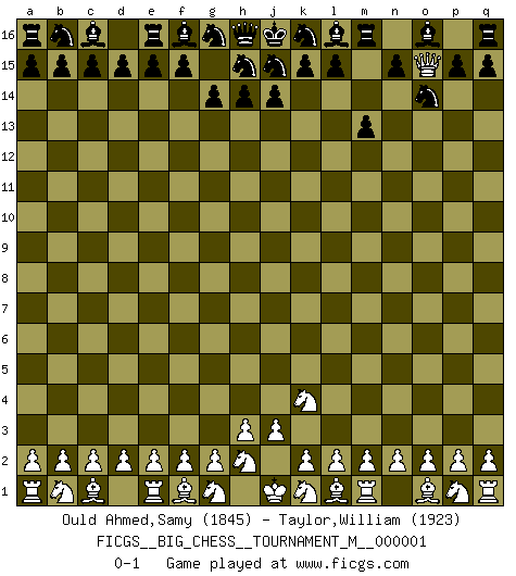 Last move : 0-1 2008 November 23 21:54:1 [Event "FICGS__BIG_CHESS__TOURNAMENT_M__000001"] [Site "FICGS"] [Date "2008.09.18"] [Round "1"] [White "Ould Ahmed,Samy"] [Black "Taylor,William"] [Result "0-1"] [WhiteElo "1845"] [BlackElo "1923"] 1.j2-k4 m15-m13 2.h1-o7 g15-g14 3.o7-o15 p16-o14 0-1 This big chess game has been lost on time (started : 2008.09.18 12:51:42) Follow this game move after move (download)Is Bobby Fischer quite sane ? (Salo Flohr) Die Arbeit ist etwas Unnatürliches. Die Faulheit allein ist göttlich. (Anatole France) El Ajedrez es un invernadero donde los frutos del carácter pueden madurar mas completamente que en la vida. (Edward Morgan Foster) Un millionnaire : 'Monsieur Steinitz ! Vous ne participez aux tournois que pour l'argent, alors que moi je n'y viens que pour l'honneur.' Steinitz : 'Chacun joue pour ce qu'il n'a pas'... Even the best needles are not sharp at both ends. (Chinese proverb)
