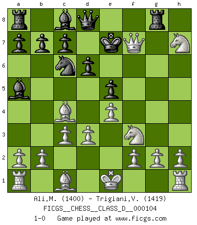 Last move : 1-0 2008 September 28 6:10:46 [Event "FICGS__CHESS__CLASS_D__000104"] [Site "FICGS"] [Date "2008.09.18"] [Round "1"] [White "Ali,Mohammad Wasif"] [Black "Trigiani,Vincenzo"] [Result "1-0"] [WhiteElo "1400"] [BlackElo "1419"] 1.e4 e5 2.Nc3 Nf6 3.Bc4 Bc5 4.d3 Ng4 5.Qxg4 Nc6 6.Qxg7 Rf8 7.Nf3 d6 8.Nd5 Bb4+ 9.c3 Ba5 10.Nf6+ Ke7 11.Nxh7 Rg8 12.Qxf7+ 1-0 Vienna game Player White won this chess game. Follow this game move after move (download)Bobby just drops the pieces and they fall on the right squares. (Miguel Najdorf) Je mehr wir mit Computern analysieren, desto mehr glauben wir an Verteidigung. (Vladimir Kramnik) Los problemas de Ajedrez exigen del compositor las mismas virtudes que caracterizan todo el arte de valor: originalidad, invención, concisión, armonía, complejidad e insinceridad explendida. (Vladimir Nabokov) Plusieurs personnes se sont demandées comment Tal faisait pour gagner... En fait, c'est très simple ! Il met ses pièces au centre de l'échiquier et les sacrifie quelque part ! (David Bronstein) They say in chess you've got to kill the queen, and then you mate it... Oh I, do you ? (Red Hot Chili Peppers, Fortune faded)