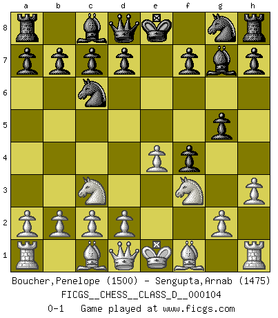 Last move : 0-1 2008 November 30 10:33:14 [Event "FICGS__CHESS__CLASS_D__000104"] [Site "FICGS"] [Date "2008.09.18"] [Round "1"] [White "Boucher,Penelope"] [Black "Sengupta,Arnab"] [Result "0-1"] [WhiteElo "1500"] [BlackElo "1475"] 1.e4 e5 2.f4 exf4 3.Nf3 g5 4.h3 Bg7 5.Nc3 Nc6 0-1 This chess game has been lost on time (started : 2008.09.18 16:49:1) King's knight's gambit Player Black won this chess game. Follow this game move after move (download)Bobby Fischer's current state of mind is indeed a tragedy. One of the world's greatest Chess players - the pride and sorrow of American Chess. (Frank Brady) Woher wissen wir, daß der Neanderthaler Blindschach gespielt hat? -- Bei Ausgrabungen wurden keine Schachbretter und Figuren gefunden. (Anonymous) Aquellos que dicen entender al Ajedrez, no entienden nada. (Robert Hubner) Les ravages du H expliquent la différence de niveau entre Tal et Thal [Abergel]. I find your interest interesting. (Gregory House, House M.D.)
