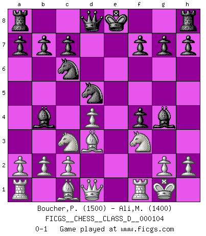 Last move : 0-1 2008 November 13 21:1:47 [Event "FICGS__CHESS__CLASS_D__000104"] [Site "FICGS"] [Date "2008.09.18"] [Round "1"] [White "Boucher,Penelope"] [Black "Ali,Mohammad Wasif"] [Result "0-1"] [WhiteElo "1500"] [BlackElo "1400"] 1.e4 e5 2.f4 exf4 3.Nf3 Nc6 4.d4 Nf6 5.Nc3 Bb4 6.Bd3 d5 7.exd5 Nxd5 8.O-O Bg4 0-1 This chess game has been lost on time (started : 2008.09.18 16:49:1) King's knight's gambit Kingside Castling by player White (move 8) Player Black won this chess game. Follow this game move after move (download)Chess is a foolish expedient for making idle people believe they are doing something very clever when they are only wasting their time. (George Bernard Shaw) Der Vorposten provoziert a) eine Basis für neue Angriffe und b) eine Schwächung der gegnerischen Widerstandskraft in der fraglichen Linie. (Aaron Nimzowitsch) Los Peones son el alma de una partida de Ajedrez. (Francois Andre Danican Philidor) Les réformistes prétendent que les progrès de la théorie conduiront à la disparition des échecs, et qu'il faut, pour leur rendre vie, en remanier les règles. En réalité, qu'exprime cette affirmation? Le mépris de l'intuition, de l'imagination et de tous les autres éléments qui font des échecs un art. (Alexander Alekhine) For a mechanic, you seem to do an excessive amount of thinking. (C-3PO in Star Wars ep.2)