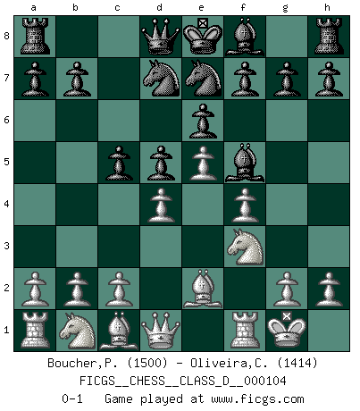 Last move : 0-1 2008 November 8 20:15:4 [Event "FICGS__CHESS__CLASS_D__000104"] [Site "FICGS"] [Date "2008.09.18"] [Round "1"] [White "Boucher,Penelope"] [Black "Oliveira,Carlos"] [Result "0-1"] [WhiteElo "1500"] [BlackElo "1414"] 1.e4 c6 2.f4 d5 3.e5 Bf5 4.Nf3 e6 5.Be2 c5 6.O-O Nd7 7.d4 Ne7 0-1 This chess game has been lost on time (started : 2008.09.18 16:49:1) Caro-Kann defense Kingside Castling by player White (move 6) Player Black won this chess game. Follow this game move after move (download)The enormous mental resilience, without which no Chess player can exist, was so much taken up by Chess that he could never free his mind of this game. (Albert Einstein) Mein erstes Ziel war nicht, die Partie zu gewinnen, sondern eine Figur zu opfern. -- der junge (Wilhelm Steinitz) Observen a Garry Kasparov. Después de una derrota, invariablemente el gana la próxima partida. Prácticamente hace pedazos a su siguiente oponente. Eso es algo que tenemos que aprender a lograr. (Maurice Ashley) Votre seul travail dans les ouvertures est d'obtenir un milieu de partie jouable. (Lajos Portish) Some people are so afraid to die that they never begin to live. (Henry Van Dyke)