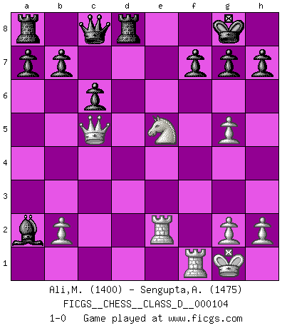 Last move : 1-0 2009 January 1 17:4:5 [Event "FICGS__CHESS__CLASS_D__000104"] [Site "FICGS"] [Date "2008.09.18"] [Round "1"] [White "Ali,Mohammad Wasif"] [Black "Sengupta,Arnab"] [Result "1-0"] [WhiteElo "1400"] [BlackElo "1475"] 1.e4 e5 2.Nf3 Nf6 3.Nxe5 d6 4.Nf3 Nxe4 5.d4 d5 6.Bd3 Nc6 7.O-O Be7 8.Nc3 Bf5 9.Bxe4 dxe4 10.Ne5 Nxd4 11.Re1 e3 12.Bxe3 Nxc2 13.Qf3 Be6 14.Rad1 Qc8 15.Re2 Nxe3 16.Qxe3 O-O 17.Nd5 Bh4 18.Qe4 Bg5 19.f4 c6 20.fxg5 Bxd5 21.Qd4 Bxa2 22.Qc5 Rd8 23.Rf1 1-0 Petrov : Classical attack Kingside Castling by player White (move 7) Kingside Castling by player Black (move 16) Player White won this chess game. Follow this game move after move (download)Any material change in a position must come about by mate, a capture, or a Pawn promotion. (Purdy) Wenn ich einen Club besuche, sind die Spieler stumm vor Staunen. (José Raúl Capablanca) Vive, pierde y aprende al observar a tu oponente como ganar. (Amber Steenbock) D'abord les bases : Jouez et étudiez, puis étudiez et jouez, ensuite jouez et étudiez, puis étudiez et jouez. Deuxièmement : Donnez toujours le meilleur de vous-même ! (Ken Smith) Hello Thibault, if I have had a plan (and I had one, I hope), I have forgotten it during the last week... - Hello Heinz-Georg. What do you mean a plan ? (Anonymous players, during a Big Chess game)