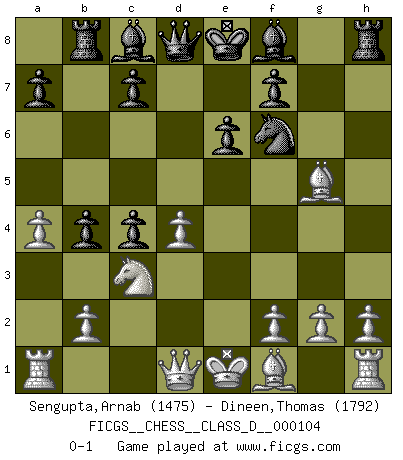 Last move : 0-1 2009 January 12 6:39:12 [Event "FICGS__CHESS__CLASS_D__000104"] [Site "FICGS"] [Date "2008.09.18"] [Round "1"] [White "Sengupta,Arnab"] [Black "Dineen,Thomas"] [Result "0-1"] [WhiteElo "1475"] [BlackElo "1792"] 1.d4 Nf6 2.c4 e6 3.Nf3 d5 4.Bg5 dxc4 5.e4 b5 6.e5 h6 7.Bh4 g5 8.Nxg5 hxg5 9.Bxg5 Nbd7 10.Nc3 Rb8 11.exf6 Nxf6 12.a4 b4 0-1 This chess game has been lost on time (started : 2008.09.18 16:49:1) Queen's pawn game Player Black won this chess game. Follow this game move after move (download)A bad plan is better than none at all. (Frank Marshall) Dein Körper muss in Topform sein. Dein Schach verfällt, wenn dein Körper verfällt. Der Körper kann nicht vom Geist getrennt werden. (Robert James Fischer) Es muy difícil jugar en contra de la teoría de Einstein. - en su primera derrota en contra de Fischer (Mikhail Tal) C'est la seule position que je connaisse où les deux camps sont mals. Propos prêtés à V. Anand. He who laughs last probably does not get the joke. (Unknown)