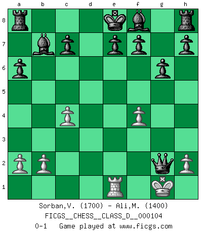 Last move : 0-1 2008 October 6 0:0:25 [Event "FICGS__CHESS__CLASS_D__000104"] [Site "FICGS"] [Date "2008.09.18"] [Round "1"] [White "Sorban,Victor"] [Black "Ali,Mohammad Wasif"] [Result "0-1"] [WhiteElo "1700"] [BlackElo "1400"] 1.f4 d5 2.Nf3 g6 3.Nc3 Nc6 4.d4 Nf6 5.e4 dxe4 6.d5 exf3 7.Bb5 fxg2 8.Rg1 a6 9.Bxc6+ bxc6 10.Rxg2 cxd5 11.Rd2 Bg4 12.Rxd5 Nxd5 13.Nxd5 Bxd1 14.Ne3 Bf3 15.Kf2 Bb7 16.c4 Qd4 17.Bd2 Qxd2+ 18.Kf1 Qxe3 19.Re1 Qf3+ 20.Kg1 Qg2+ 0-1 Bird's Opening Player Black won this chess game. Follow this game move after move (download)I feel as if I were a piece in a game of Chess, when my opponent says of it: That piece cannot be moved. (Soren Kierkegaard) Schach ist das Spiel, das die Verrückten gesund hält. (Albert Einstein) El Ajedrez es un juego de pelea el cual es puramente intelectual e incluye la suerte. (Richard Reti) Pour moi, les échecs ne sont pas un jeu mais un art. (Alexandre Alekhine) The problem with manipulation is that people can turn on you. (Horatio Caine, C.S.I. Miami)
