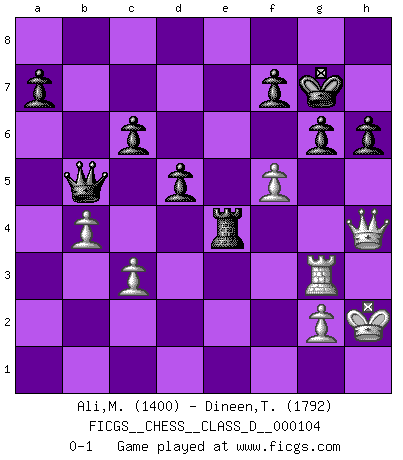 Last move : 0-1 2009 March 3 10:7:22 [Event "FICGS__CHESS__CLASS_D__000104"] [Site "FICGS"] [Date "2008.09.18"] [Round "1"] [White "Ali,Mohammad Wasif"] [Black "Dineen,Thomas"] [Result "0-1"] [WhiteElo "1400"] [BlackElo "1792"] 1.e4 e6 2.d4 d5 3.Nd2 c5 4.exd5 exd5 5.Ngf3 Nc6 6.Bb5 Bd6 7.O-O cxd4 8.Re1+ Nge7 9.Nb3 Bg4 10.Nbxd4 O-O 11.Be3 Nxd4 12.Bxd4 Nc6 13.Bxc6 bxc6 14.Qd3 Bxf3 15.Qxf3 Bxh2+ 16.Kxh2 Qh4+ 17.Kg1 Qxd4 18.c3 Qc5 19.Re3 Rae8 20.Rae1 Rxe3 21.Rxe3 Qa5 22.a3 Qb5 23.b4 Qa6 24.Qf5 Qxa3 25.Qd7 Qa4 26.Kh2 h6 27.Rg3 Qb5 28.Qg4 g6 29.Qh4 Kg7 30.f4 Re8 31.f5 Re4 0-1 French : Tarrasch, Open variation, Main line Kingside Castling by player White (move 7) Kingside Castling by player Black (move 10) Player Black won this chess game. Follow this game move after move (download)Pawn endings are to Chess what putting is to golf. (Cecil Purdy) Am wohlsten fühle ich mich, wenn ich sehe, wie sich mein Gegner im Todeskampf windet. (Robert James Fischer) El muchacho (en ese entonces un niño de 12 años llamado Anatoly Karpov) no tiene ni idea de lo que es el Ajedrez y no hay futuro en absoluto para el en esta profesión. (Mikhail Botvinnik) Il n'y a plus de joueurs du niveau de Jacob Murray dont la seule quête est le beau jeu, le plaisir de voir les pièces construire quelque chose. Sur 10 idées à la minute, 9 seront sans intérêt, la dernière s'avèrera géniale. (Christian Bauer) Two beer, or not two beer. (Unknown)