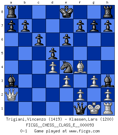 Last move : 0-1 2008 October 4 0:23:17 [Event "FICGS__CHESS__CLASS_E__000093"] [Site "FICGS"] [Date "2008.09.18"] [Round "1"] [White "Trigiani,Vincenzo"] [Black "Klassen,Lars"] [Result "0-1"] [WhiteElo "1419"] [BlackElo "1200"] 1.d4 d5 2.Nc3 Nf6 3.Bf4 Na6 4.Nf3 c6 5.b4 Nxb4 6.a3 Bf5 7.e3 Nxc2+ 8.Ke2 Nxa1 9.Qxa1 Qb6 10.Kd1 e6 11.Be2 Qb3+ 12.Kd2 Bxa3 13.Qa2 Qb4 14.g3 Ne4+ 15.Ke1 Qxc3+ 16.Kf1 Bh3+ 17.Kg1 Qc1+ 18.Ne1 Qxe1+ 19.Bf1 Qxf1+ 0-1 Queen's pawn : Chigorin variation Player Black won this chess game. Follow this game move after move (download)Pawns are born free, yet they are everywhere in chains. (Rick Kennedy) Obwohl ich vom Stil her kaum zu den Priestern der Schachkunst gezählt werde, halte ich Schach doch für eine Kunst. (Tigran Petrosjan) Durante una competencia de Ajedrez, un Maestro de Ajedrez deberá ser una combinación de presa de caza y un Monge. (Alexander Alekhine) J'ai vu le vaincu d'Echecs jouer des années durant dans l'espoir de la fête de la victoire. Car tu es plus riche de ce qu'elle existe si même elle n'est point pour toi. Ainsi de la perle du fond des mers. (Antoine de Saint-Exupéry) There is a computer disease that anybody who works with computers knows about. It's a very serious disease and it interferes completely with the work. The trouble with computers is that you 'play' with them ! (Richard P. Feynman)