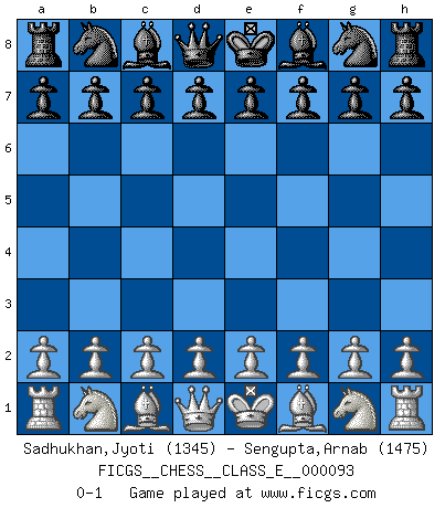 Last move : 0-1 2008 November 4 19:49:5 [Event "FICGS__CHESS__CLASS_E__000093"] [Site "FICGS"] [Date "2008.09.18"] [Round "1"] [White "Sadhukhan,Jyoti"] [Black "Sengupta,Arnab"] [Result "0-1"] [WhiteElo "1345"] [BlackElo "1475"] 0-1 This chess game has been lost on time (started : 2008.09.18 16:49:33) Player Black won this chess game. Follow this game move after move (download)Many have become Chess Masters, no one has become the Master of Chess. (Siegbert Tarrasch) Die Idee von Capablanca, Schach als Fach in den Schulen zu lehren, ist großartig. (Fidel Castro) Debemos de asegurarnos de que el Ajedrez no se convierta en un lenguaje muerto, muy interesante, pero solo para un grupo muy pequeño. (Sytze Faber) Le temps de noter son nom sur la feuille de partie, j'étais déjà en zeitnot ! D'un modeste amateur apparié lors de la première ronde d'un open contre le grand-maître Azmaïparashvili. If you have any trouble condescending, find a Unix user to show you how it's done. (Scott Adams)