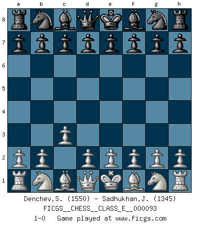 Last move : 1-0 2008 November 5 19:51:14 [Event "FICGS__CHESS__CLASS_E__000093"] [Site "FICGS"] [Date "2008.09.18"] [Round "1"] [White "Denchev,Stanimir"] [Black "Sadhukhan,Jyoti"] [Result "1-0"] [WhiteElo "1550"] [BlackElo "1345"] 1.c3 1-0 This chess game has been lost on time (started : 2008.09.18 16:49:33) Saragossa Opening Player White won this chess game. Follow this game move after move (download)I believe that Chess possesses a magic that is also a help in advanced age. A rheumatic knee is forgotten during a game of Chess and other events can seem quite unimportant in comparison with a catastrophe on the chessboard. (Vlastimil Hort) Frage: Gibt es etwas was Sie mehr lieben als Autobahnen ohne Tempobegrenzungen? - Antwort: Deutsche Frauen ohne Tempobegrenzungen. (Loek van Wely) Las leyes del Ajedrez no permiten una libre elección: tienes que mover quieras o no. (Emanuel Lasker) C'est la seule position que je connaisse où les deux camps sont mals. Propos prêtés à V. Anand. To steal ideas from one person is plagiarism. To steal from many is research. (Unknown)