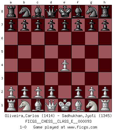 Last move : 1-0 2008 November 4 19:49:5 [Event "FICGS__CHESS__CLASS_E__000093"] [Site "FICGS"] [Date "2008.09.18"] [Round "1"] [White "Oliveira,Carlos"] [Black "Sadhukhan,Jyoti"] [Result "1-0"] [WhiteElo "1414"] [BlackElo "1345"] 1.e4 1-0 This chess game has been lost on time (started : 2008.09.18 16:49:33) King's pawn Opening Player White won this chess game. Follow this game move after move (download)One of these modest little moves may be more embarrassing to your opponent than the biggest threat. (Siegbert Tarrasch) Drei Punkte vor allen anderen ist wie einer, der im weißen Anzug posiert, während der Rest in Müllsäcke gekleidet dasteht. (Viktor Kortschnoi) En el Ajedrez, tal como es jugado por los Maestros, practicamente la suerte es eliminada. (Emanuel Lasker) Pour moi, les échecs ne sont pas un jeu mais un art. (Alexandre Alekhine) You think that education is too expensive ? Try ignorance. (Derek Bok)