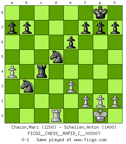 Last move : 0-1 2006 August 20 17:48:25 [Event "FICGS__CHESS__RAPID_C__000007"] [Site "FICGS"] [Date "2006.08.12"] [Round "1"] [White "Chacon,Marc"] [Black "Schellen,Anton"] [Result "0-1"] [WhiteElo "1200"] [BlackElo "1400"] 1.d4 d5 2.c4 dxc4 3.e3 Nf6 4.Bxc4 e6 5.Nf3 c5 6.O-O cxd4 7.Nxd4 Be7 8.Nb5 O-O 9.Qxd8 Bxd8 10.Nd6 Nc6 11.b3 Bc7 12.Ba3 Rd8 13.Nxc8 Raxc8 14.Bb5 Be5 15.Nc3 Bxc3 16.Rac1 Bb4 17.Bxb4 Nxb4 18.Rxc8 Rxc8 19.a3 Nbd5 20.a4 Ne4 21.Rb1 Nd2 22.Rd1 Nxb3 23.Bc4 Rxc4 0-1 Queen's gambit accepted Kingside Castling by player White (move 6) Kingside Castling by player Black (move 8) Player Black won this chess game. Follow this game move after move (download)In Chess, at least, the brave inherit the earth. (Edmar Mednis) Wenn Schach ein enormer Dschungel ist, der seine Myriaden von Geheimnissen nicht preisgeben will, dann sind Computer die Kettensägen einer gewaltigen ökologisch unsensiblen Nutzholzfirma. (Nigel Short) Coloca el contenido de las piezas del Ajedrez en un sombrero, agitalo vigorosamente, arrojalas en un tablero desde una altura de 30 centimetros y así obtendras el estilo de Steinitz. (H. E. Bird) Le profane ne songe pas à la somme de jouissance dont il se prive, qui méconnaît ce jeu aux ressources aussi variées que passionnantes. (Jean-Marie Jeanton-Lamarche) Never risk one's whole fortune unless supported by one's entire army. (Niccolo Machiavelli)