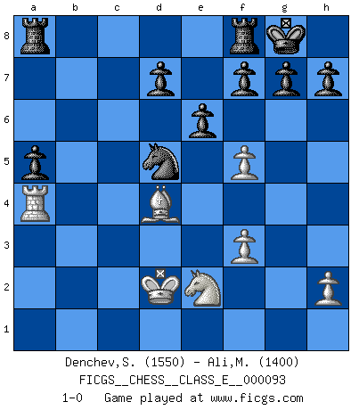 Last move : 1-0 2009 February 23 21:39:16 [Event "FICGS__CHESS__CLASS_E__000093"] [Site "FICGS"] [Date "2008.09.18"] [Round "1"] [White "Denchev,Stanimir"] [Black "Ali,Mohammad Wasif"] [Result "1-0"] [WhiteElo "1550"] [BlackElo "1400"] 1.d4 Nf6 2.f4 Nc6 3.d5 Nb4 4.Nc3 c6 5.e4 cxd5 6.exd5 Qa5 7.Bc4 b5 8.Bb3 Bb7 9.Bd2 Qa6 10.a4 bxa4 11.Rxa4 Qb6 12.Qf3 e6 13.Be3 Qc7 14.Nb5 Qc8 15.c4 a6 16.Nc3 Nd3+ 17.Kd2 Nxb2 18.Ra2 Nxc4+ 19.Bxc4 Qxc4 20.Ra4 Bb4 21.Nge2 Nxd5 22.Rxb4 Qxb4 23.Rb1 Nxc3 24.Rxb4 Bxf3 25.gxf3 Nd5 26.Ra4 O-O 27.Bd4 a5 28.f5 1-0 This chess game has been lost on time (started : 2008.09.18 16:49:33) Canard Opening Kingside Castling by player Black (move 26) Player White won this chess game. Follow this game move after move (download)Openings teach you openings. Endgames teach you chess ! (Stephan Gerzadowicz) Der Knackpunkt bei der Konzentration ist, daß wir nur durch sie etwas Neues und Ungewöhnliches am Schachbrett finden können. Sie ist der einzige Weg durch neue neue Ideen eine Überraschung zu bereiten. (Garry Kasparov) Una compensación adecuada por un sacrificio es tener una combinación sólida que conduce a una posición ganadora; una compensación adecuada por una metida de pata es dejar a tu oponente arrebatar una derrota de las fauces de la victoria. (Bruce A. Moon) Si rien de grave n'est détecté lors de l'analyse d'une position, on joue alors le coup. Seconde règle de Blumenfeld. Everything in life is luck. (Donald Trump)