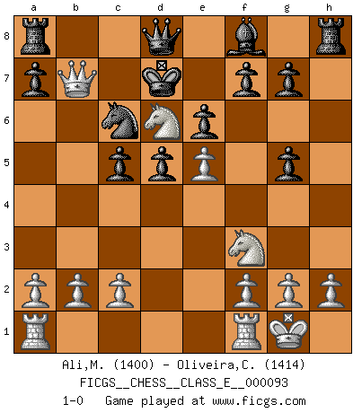Last move : 1-0 2008 October 20 13:41:52 [Event "FICGS__CHESS__CLASS_E__000093"] [Site "FICGS"] [Date "2008.09.18"] [Round "1"] [White "Ali,Mohammad Wasif"] [Black "Oliveira,Carlos"] [Result "1-0"] [WhiteElo "1400"] [BlackElo "1414"] 1.e4 c6 2.d4 d5 3.e5 Bf5 4.Nc3 e6 5.Nf3 Nd7 6.Bd3 Bxd3 7.Qxd3 Ne7 8.O-O c5 9.Bg5 h6 10.Nb5 Nxe5 11.dxe5 hxg5 12.Nd6+ Kd7 13.Qb5+ Nc6 14.Qxb7+ 1-0 Caro-Kann : Advance variation Kingside Castling by player White (move 8) Player White won this chess game. Follow this game move after move (download)Chess is the art which expresses the science of logic. (Mikhail Botvinnik) Alles was ich jemals tun will ist Schach spielen. (Robert James Fischer) No es tiempo de jugar al Ajedrez cuando la casa esta en llamas. (Proverbio Italiano) La menace est plus forte que l'exécution. (Aaron Nimzovitch) When it is a question of money, everybody is of the same religion. (Voltaire)