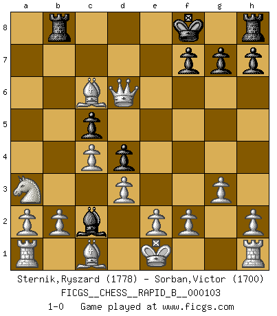Last move : 1-0 2008 September 27 18:53:4 [Event "FICGS__CHESS__RAPID_B__000103"] [Site "FICGS"] [Date "2008.09.18"] [Round "1"] [White "Sternik,Ryszard"] [Black "Sorban,Victor"] [Result "1-0"] [WhiteElo "1778"] [BlackElo "1700"] 1.Nf3 d5 2.c4 d4 3.g3 e5 4.Nxe5 Nc6 5.Nxc6 Bf5 6.Nxd8 Rxd8 7.Qa4+ c6 8.Qxa7 Bc2 9.Bg2 Nf6 10.Qxb7 c5 11.Bc6+ Nd7 12.d3 Bd6 13.Na3 Rb8 14.Qxd7+ Kf8 15.Qxd6+ 1-0 Reti : Advance variation Player White won this chess game. Follow this game move after move (download)Chess is ruthless: you've got to be prepared to kill people. (Nigel Short) Wer der Ansicht ist, daß alle Schachspieler verrückt sind, wird durch Studium des Lebens von Emil Josef Diemer nicht auf andere Gedanken kommen. (Hans Ree) El Ajedrez tiene tanto misterio como las mujeres. (Purdy) Echiquier : carré parfait, comme la Jérusalem nouvelle décrite par l'auteur de l'Apocalypse, huit cases sur huit, exaltation du chiffre 4, symbole du cosmos aux quatre horizons... où le noir et le blanc, l'ombre et la lumière, le mal et le bien s'entremêlent et se conjuguent. (Robert Couffignal, Le Gambit du poète) Inventor: A person who makes an ingenious arrangement of wheels, levers and springs, and believes it civilization. (Ambrose Bierce, The Devil's Dictionary)