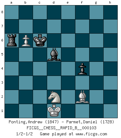 Last move : 1/2-1/2 2009 May 3 10:23:35 [Event "FICGS__CHESS__RAPID_B__000103"] [Site "FICGS"] [Date "2008.09.18"] [Round "1"] [White "Ponting,Andrew"] [Black "Parmet,Daniel"] [Result "1/2-1/2"] [WhiteElo "1847"] [BlackElo "1728"] 1.e4 e5 2.Nf3 Nc6 3.Bc4 Nf6 4.Ng5 d5 5.exd5 Na5 6.Bb5+ c6 7.dxc6 bxc6 8.Be2 h6 9.Nf3 e4 10.Ne5 Qd4 11.f4 Bc5 12.Rf1 Qd8 13.c3 Bb6 14.b4 Nb7 15.Qa4 O-O 16.Qxc6 Re8 17.Na3 Re6 18.Qa4 Nd5 19.Bc4 Qh4+ 20.Kd1 Qd8 21.Kc2 a5 22.Qb5 Rd6 23.Nc6 Rxc6 24.Qxd5 Qf6 25.Qe5 axb4 26.Qxf6 Rxf6 27.cxb4 Nd6 28.Bd5 Ra7 29.Bb2 Rf5 30.Bb3 Ba6 31.Rfe1 Bf2 32.Rh1 Rc7+ 33.Kd1 e3 34.dxe3 Bxe3 35.Re1 Bxf4 36.g4 Rg5 37.h3 Bb7 38.Rf1 Bg3 39.Bd4 Bg2 40.Rg1 Bf3+ 41.Kd2 Bf4+ 42.Kd3 Bb7 43.Ke2 Ne4 44.Rge1 Bd2 45.b5 Bxe1 46.Rxe1 Re7 47.b6 Nc5 48.Kd1 Rxe1+ 49.Kxe1 Nxb3 50.axb3 Rd5 51.Nc2 Rb5 52.b4 Be4 53.Kd2 Rd5 54.b7 Rb5 55.Bc5 Rxb7 56.Nd4 Bg2 57.h4 Bh3 58.g5 hxg5 59.hxg5 Kh7 60.Ke3 Kg6 61.Kf4 Rd7 62.Nf3 Rd1 63.Be3 Rf1 64.Kg3 Bc8 65.b5 Kf5 66.b6 Rb1 67.Nd2 Rb4 68.Kf3 Ke5 69.Kf2 Kd5 70.Ke2 Bf5 71.Kf1 Kc6 72.Nf3 Be6 73.Kf2 Rb2+ 74.Nd2 f5 75.gxf6 gxf6 76.Kg3 Rb4 77.Kf2 f5 78.Kf3 Ra4 79.Nb1 Bf7 80.Nd2 Bd5+ 81.Ke2 f4 82.Bf2 Ra3 83.Kd1 Ra6 1/2-1/2 Two knights defense Kingside Castling by player Black (move 15) 10 pieces endgame at move 59 : White KBNPP , Black KRBPP WHITE : King + 1 Bishop 1 Knight 2 Pawns BLACK : King + 1 Rook 1 Bishop 2 Pawns 9 pieces endgame at move 75 : White KBNPP , Black KRBP WHITE : King + 1 Bishop 1 Knight 2 Pawns BLACK : King + 1 Rook 1 Bishop 1 Pawn 8 pieces endgame at move 75 : White KBNP , Black KRBP WHITE : King + 1 Bishop 1 Knight 1 Pawn BLACK : King + 1 Rook 1 Bishop 1 Pawn This chess game ended in a draw. Follow this game move after move (download)When you don't know what to play, wait for an idea to come into your opponent's mind. You may be sure that idea will be wrong. (Siegbert Tarrasch) Ich weiss nicht was Gott gegen mich auf 1.e4 antworten würde. (Robert James Fischer) Jugadores de primera clase pierden en contra de jugadores de segunda clase porque los jugadores de segunda clase a veces juegan una partida de primer clase. (Siegbert Tarrasch) Assurément je connaissais par expérience le mystérieux attrait de ce jeu royal, le seul entre tous les jeux inventés par les hommes qui échappe souverainement à la tyrannie du hasard, le seul où l'on ne doive sa victoire qu'à son intelligence ou plutôt à une certaine forme d'intelligence. Mais n'est-ce pas déjà le limiter injurieusement que d'appeler les échecs un jeu ? N'est-ce pas une science, un art ou quelque chose qui, comme le cercueil de Mahomet entre ciel et terre, est suspendu entre l'un et l'autre, et qui réunit un nombre incroyable de contraires ? [...] C'est une pensée qui ne mène à rien, une mathématique qui n'établit rien, un art qui ne laisse pas d'uvre, une architecture sans matière; et il l'a prouvé néanmoins qu'il était plus durable, à sa manière, que les livres ou que tout autre monument, ce jeu unique qui appartient à tous les peuples et à tous les temps, et dont personne ne sait quel dieu en fit don à la terre pour tuer l'ennui, pour aiguiser l'esprit et stimuler l'âme. Où commence-t-il, où finit-il ? (Stefan Zweig) Train yourself to let go of everything you fear to lose. (Master Yoda in Star Wars ep.3)
