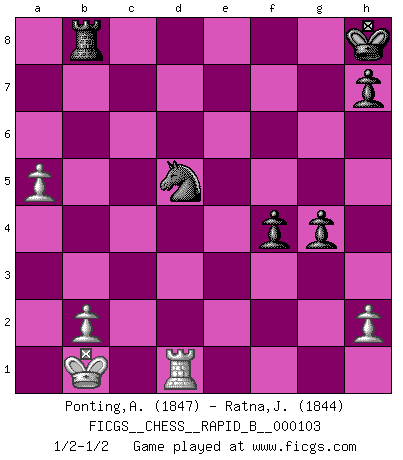 Last move : 1/2-1/2 2008 October 29 9:48:34 [Event "FICGS__CHESS__RAPID_B__000103"] [Site "FICGS"] [Date "2008.09.18"] [Round "1"] [White "Ponting,Andrew"] [Black "Ratna,Jean-Michel"] [Result "1/2-1/2"] [WhiteElo "1847"] [BlackElo "1844"] 1.e4 c5 2.Nf3 d6 3.d4 cxd4 4.Nxd4 Nf6 5.Nc3 a6 6.Be3 e5 7.Nb3 Be6 8.f3 Be7 9.Qd2 O-O 10.O-O-O Nbd7 11.g4 b5 12.g5 b4 13.Ne2 Ne8 14.f4 a5 15.f5 a4 16.fxe6 axb3 17.exf7+ Rxf7 18.Kb1 bxc2+ 19.Qxc2 Bxg5 20.Bxg5 Qxg5 21.Ng3 Kh8 22.Bc4 Rf4 23.Qd2 Rc8 24.Qxb4 Nc5 25.Rhe1 Qh4 26.Qd2 Nxe4 27.Nxe4 Rxe4 28.Be6 Rb8 29.Rf1 Rf4 30.Rxf4 Qxf4 31.Qxf4 exf4 32.a4 g5 33.Bd5 g4 34.a5 Nc7 35.Bc6 d5 36.Bxd5 Nxd5 1/2-1/2 Sicilian : Najdorf, Byrne (English) attack Kingside Castling by player Black (move 9) Queenside Castling by player White (move 10) This chess game ended in a draw. Follow this game move after move (download)Only the player with the initiative has the right to attack. (Wilhelm Steinitz) Es ist im Leben wie im Schachspiel. Wir entwerfen einen Plan, dieser bleibt jedoch bedingt durch das, was im Schachspiel dem Gegner, im Leben dem Schicksal zu tun belieben wird. (Arthur Schopenhauer) Un sacrificio se refuta mucho mejor al aceptarlo. (Wilhelm Steinitz) Celui qui prend des risques peut perdre, celui qui n'en prend pas perd toujours. (Xavier Tartacover) It is a good thing for an uneducated man to read books of quotations. (Winston Churchill)