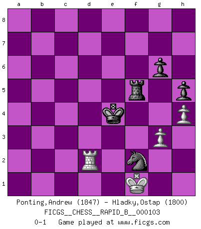 Last move : 0-1 2009 January 30 19:25:48 [Event "FICGS__CHESS__RAPID_B__000103"] [Site "FICGS"] [Date "2008.09.18"] [Round "1"] [White "Ponting,Andrew"] [Black "Hladky,Ostap"] [Result "0-1"] [WhiteElo "1847"] [BlackElo "1800"] 1.e4 e5 2.Nf3 Nc6 3.Bc4 Nf6 4.Ng5 d5 5.exd5 Na5 6.Bb5+ c6 7.dxc6 bxc6 8.Be2 h6 9.Nf3 e4 10.Ne5 Bc5 11.c3 Qc7 12.d4 exd3 13.Nxd3 Bd6 14.Nd2 Bf5 15.Nf3 O-O 16.O-O Rad8 17.b4 Nd5 18.Bd2 Nc4 19.g3 a5 20.a3 c5 21.bxc5 Bxc5 22.Nxc5 Nxc3 23.Na6 Nxe2+ 24.Qxe2 Qc6 25.Bxa5 Nxa5 26.Nb4 Qa8 27.Qe3 Bg4 28.Ne5 Bh3 29.Qf3 Qxf3 30.Nxf3 Bxf1 31.Kxf1 Rfe8 32.h4 Nc4 33.a4 Rd6 34.Kg2 Rb8 35.Nc2 Ra6 36.Ncd4 Rb4 37.Re1 R6xa4 38.Re8+ Kh7 39.Re7 Rb2 40.Ne2 R4a2 41.Nfd4 h5 42.Rxf7 Rxe2 43.Nxe2 Rxe2 44.Kf1 Rc2 45.Rf5 g6 46.Rf7+ Kg8 47.Re7 Kf8 48.Re1 Kf7 49.Kg2 Kf6 50.Kf1 Ne5 51.Re3 Kf5 52.Kg1 Ng4 53.Rf3+ Ke4 54.Rf7 Kd3 55.Kf1 Rc1+ 56.Kg2 Rc5 57.Rd7+ Ke2 58.Re7+ Kd1 59.Kf1 Rf5 60.Rd7+ Kc2 61.Rc7+ Kd3 62.Rd7+ Ke4 63.Rd2 Nxf2 0-1 Two knights defense Kingside Castling by player Black (move 15) Kingside Castling by player White (move 16) 10 pieces endgame at move 43 : White KRPPP , Black KRNPP WHITE : King + 1 Rook 3 Pawns BLACK : King + 1 Rook 1 Knight 2 Pawns 9 pieces endgame at move 63 : White KRPP , Black KRNPP WHITE : King + 1 Rook 2 Pawns BLACK : King + 1 Rook 1 Knight 2 Pawns Player Black won this chess game. Follow this game move after move (download)In Fischer's hands, a slight theoretical advantage is as good a being a Queen ahead. (Isaac Kashdan) Wenn Dein Gegner dir ein Remis anbietet, versuch herauszufinden, weshalb er glaubt schlechter zu stehen. (Nigel Short) Tu eres para mi la Reina en d8 y yo soy el Peón en d7!!. (GM Eduard Gufeld) Le temps de noter son nom sur la feuille de partie, j'étais déjà en zeitnot ! D'un modeste amateur apparié lors de la première ronde d'un open contre le grand-maître Azmaïparashvili. In God we trust, all others we virus scan. (Anonymous)