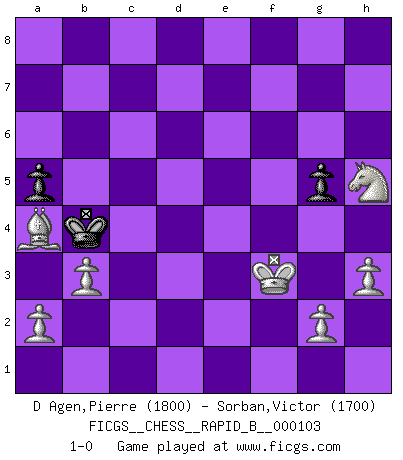 Last move : 1-0 2008 December 15 14:41:16 [Event "FICGS__CHESS__RAPID_B__000103"] [Site "FICGS"] [Date "2008.09.18"] [Round "1"] [White "D Agen,Pierre"] [Black "Sorban,Victor"] [Result "1-0"] [WhiteElo "1800"] [BlackElo "1700"] 1.d4 d5 2.c4 Nf6 3.cxd5 Qxd5 4.Nc3 Qd8 5.e4 g6 6.Bc4 Bg7 7.Nge2 b6 8.Bf4 O-O 9.e5 Ba6 10.exf6 Bxf6 11.Bxa6 Nc6 12.O-O Bxd4 13.Nxd4 Nxd4 14.Nb5 Ne6 15.Qxd8 Rfxd8 16.Bxc7 Nxc7 17.Nxc7 Rab8 18.Rfd1 h5 19.Nb5 e5 20.Rxd8+ Rxd8 21.f3 f5 22.Nc3 Kf7 23.Rd1 Rxd1+ 24.Nxd1 Kf6 25.Kf2 b5 26.Bxb5 e4 27.fxe4 fxe4 28.Ke3 Ke5 29.Nf2 a5 30.Nxe4 Kf5 31.h3 g5 32.Ng3+ Ke5 33.Nxh5 Kd5 34.Kf3 Kc5 35.Ba4 Kb4 36.b3 1-0 This chess game has been lost on time (started : 2008.09.18 21:20:47) QGD : Marshall defense Kingside Castling by player Black (move 8) Kingside Castling by player White (move 12) 10 pieces endgame at move 33 : White KBNPPPP , Black KPP WHITE : King + 1 Bishop 1 Knight 4 Pawns BLACK : King + 2 Pawns Player White won this chess game. Follow this game move after move (download)Look at Garry Kasparov. After he loses, invariably he wins the next game. He just kills the next guy. That's something that we have to learn to be able to do. (Maurice Ashley) Ich könnte leicht behaupten: Ja,ja, Leonid Breschnew wollte nicht, daß ich Weltmeister werde. In der Tat war die Sache komplizierter. (Viktor Kortschnoi) Aquel que teme a un Peón de Reina aislado, debería de retirarse del Ajedrez. (Siegbert Tarrasch) Mais l'homme est une créature légère et illogique : semblable au joueur d'échecs, il n'aime que le processus du but à atteindre, non le but lui-même. (Dostoïevsky) Luck is the residue of design. (John Milton)