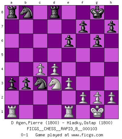 Last move : 0-1 2008 September 29 20:51:45 [Event "FICGS__CHESS__RAPID_B__000103"] [Site "FICGS"] [Date "2008.09.18"] [Round "1"] [White "D Agen,Pierre"] [Black "Hladky,Ostap"] [Result "0-1"] [WhiteElo "1800"] [BlackElo "1800"] 1.d4 d5 2.c4 c6 3.Nc3 e6 4.Nf3 dxc4 5.Bg5 Nf6 6.e3 b5 7.a4 Bb4 8.axb5 cxb5 9.Be2 Bb7 10.O-O a6 11.Qc2 O-O 12.b3 Bxc3 13.Qxc3 Ne4 14.Bxd8 Nxc3 15.Rfe1 Rxd8 16.bxc4 b4 17.Ne5 a5 18.Bh5 g6 19.Bf3 Bxf3 20.Nxf3 a4 21.Ne5 a3 22.Nd3 b3 0-1 QGD Slav defense Kingside Castling by player White (move 10) Kingside Castling by player Black (move 11) Player Black won this chess game. Follow this game move after move (download)Many Chess players were surprised when after the game, Fischer quietly explained: 'I had already analyzed this possibility' in a position which I thought was not possible to foresee from the opening. (Mikhail Tal) Kleine Schachspieler machen Mist, und große Schachspieler machen Mist, aber große machen weniger Mist. (Fritz Sämisch) Sin errores no puede haber brillantez. (Emanuel Lasker) A ce moment-là, je menaçais de comprendre la position ! (Clément L'Heureux) Experiences are the keys to life. (Daniel Parmet)