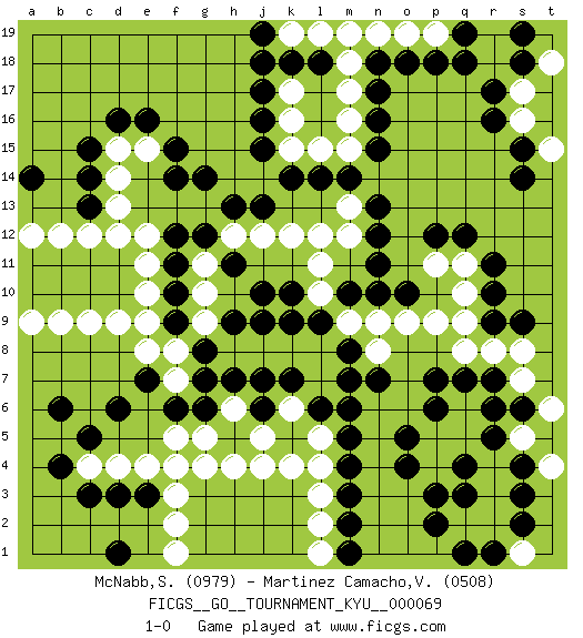 Last move : 1-0 2009 January 5 1:49:45 [Event "FICGS__GO__TOURNAMENT_KYU__000069"] [Site "FICGS"] [Date "2008.09.19"] [Round "1"] [Black "McNabb,Sean"] [White "Martinez Camacho,Victor Hugo"] [Result "1-0"] [Rating 1 "0979"] [Rating 2 "0508"] 1.r16 c4 2.q3 d9 3.d16 j4 4.r10 d15 5.e16 d12 6.c15 d14 7.f14 e15 8.f15 f4 9.c13 d13 10.c14 c12 11.m4 l4 12.m5 l5 13.f9 e9 14.f6 f8 15.j6 g9 16.f10 e10 17.f11 g10 18.d6 e11 19.f12 e12 20.g8 h8 21.g7 f7 22.e7 e8 23.h7 g11 24.g12 h12 25.g14 j8 26.l6 k4 27.e3 e4 28.c3 d4 29.d3 f3 30.b4 c9 31.c5 h4 32.b6 b9 33.h13 j12 34.j13 k12 35.k10 l12 36.j10 g4 37.h11 l10 38.h9 k8 39.m8 l8 40.l9 m9 41.k9 l7 42.m7 k6 43.m6 j7 44.j9 h6 45.k7 j5 46.j7 g5 47.g6 f5 48.m3 l3 49.m2 l2 50.l14 f2 51.d1 f1 52.n13 m12 53.n12 l1 54.m1 l11 55.n10 m13 56.m14 n9 57.m10 o9 58.n11 b12 59.a14 a12 60.p7 p9 61.q12 q9 62.r9 q8 63.q7 r8 64.r7 m15 65.n15 m16 66.n16 m17 67.j17 a9 68.n17 l15 69.j15 k15 70.k14 k16 71.j16 k17 72.l18 m18 73.k18 m19 74.n18 q10 75.r11 q11 76.p12 n8 77.n7 n19 78.o18 l19 79.j18 o19 80.p18 p19 81.q18 k19 82.j19 r19 83.q19 r18 84.r17 s17 85.s18 s16 86.s15 t18 87.s19 t15 88.s14 s8 89.s9 s7 90.s6 p11 91.o10 r6 92.r5 q6 93.p6 q5 94.q4 p5 95.o5 p4 96.p3 s5 97.o4 t6 98.r6 r4 99.s4 r3 100.s3 r2 101.s2 q2 102.p2 s1 103.q1 t4 104.r1 1-0 Here are the names of the openings (joseki) played in the four corners : Corner d16 : d16 d15 Hoshi (Hwajeom, Seongjeom, Xingwei`) 4-4 Point. The star or hoshi (4-4) point, emphasizing influence at the potential expense of territory. Corner q16 : r16 l12 Komoku (Somok, Xiao~mu`) 3-4 Point. The komoku (3-4) point is the traditional corner enclosure move.. Player Black won this Go (weiqi, baduk) game. Follow this game move after move (download)It is difficult to know exactly what you are doing. (Pierre Audouard) We cannot be sure of having something to live for unless we are willing to die for it. (Ernesto Che Guevara)