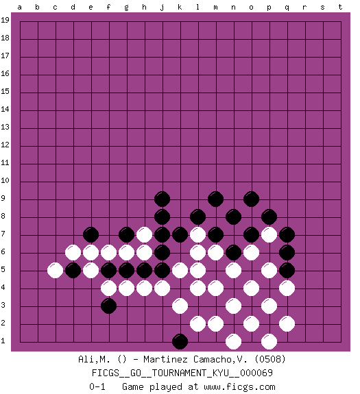 Last move : 0-1 2008 December 18 14:55:20 [Event "FICGS__GO__TOURNAMENT_KYU__000069"] [Site "FICGS"] [Date "2008.09.19"] [Round "1"] [Black "Ali,Mohammad Wasif"] [White "Martinez Camacho,Victor Hugo"] [Result "0-1"] [Rating 2 "0508"] 1.n6 p5 2.p8 p7 3.o7 o6 4.q7 n5 5.o5 o4 6.m5 m4 7.m3 l5 8.l3 m6 9.m7 n3 10.q6 m2 11.o3 o2 12.n2 n1 13.p4 p3 14.p2 q4 15.n8 l4 16.o9 l2 17.m9 k3 18.l8 l7 19.k4 k5 20.k7 l6 21.j6 j4 22.j8 h6 23.h5 h4 24.g5 g6 25.j7 g4 26.j5 q2 27.j9 h7 28.g7 f6 29.f5 f4 30.f3 e5 31.q5 p1 32.k1 e6 33.d5 d6 34.e7 c5 0-1 This go game has been lost on time (started : 2008.09.19 7:53:44) Here are the names of the openings (joseki) played in the four corners : Corner q4 : n6 p5 This joseki is unknown. A weak or weird move has probably been played in this corner. Corner d4 : j6 j4 This joseki is unknown. A weak or weird move has probably been played in this corner. Player White won this Go (weiqi, baduk) game. Follow this game move after move (download)In the corner, five stones in a row on the third line are alive. (Anonymous) Creativity involves breaking out of established patterns in order to look at things in a different way. (Edward De Bono)