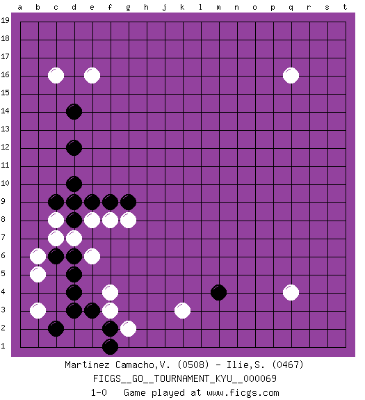 Last move : 1-0 2008 November 26 10:0:6 [Event "FICGS__GO__TOURNAMENT_KYU__000069"] [Site "FICGS"] [Date "2008.09.19"] [Round "1"] [Black "Martinez Camacho,Victor Hugo"] [White "Ilie,Sebastian"] [Result "1-0"] [Rating 1 "0508"] [Rating 2 "0467"] 1.d4 c16 2.m4 q16 3.d10 q4 4.d14 e16 5.d12 d7 6.d8 c8 7.c9 e8 8.d9 c7 9.d6 e6 10.d5 f4 11.e3 f3 12.d3 b5 13.c6 b6 14.e9 f8 15.f9 g8 16.g9 k3 17.f2 g2 18.f1 b3 19.c2 1-0 This go game has been lost on time (started : 2008.09.19 7:53:44) Here are the names of the openings (joseki) played in the four corners : Corner q4 : m4 q4 This joseki is unknown. A weak or weird move has probably been played in this corner. Corner d16 : c16 d14 Komoku (Somok, Xiao~mu`) 3-4 Point. The komoku (3-4) point is the traditional corner enclosure move.. Corner d4 : d4 d7 Hoshi (Hwajeom, Seongjeom, Xingwei`) 4-4 Point. The star or hoshi (4-4) point, emphasizing influence at the potential expense of territory. Nikken Takagakari (Dukan Nop'dakeolch'im, E`r Gaojia, 2-Space High Approach). White 2 is a light approach move. Rarely played in even games, White 2 is typically employed in handicap games. Black continues with 6-4 or 3-10. In Korean Sunjang Baduk Black has a stone on 8-4. Player Black won this Go (weiqi, baduk) game. Follow this game move after move (download)A basic: Don't push too hard. (Jansteen) It's only after you lost everything, Tyler says, that you're free to do anything. (Chuck Palahniuk, Fight Club)