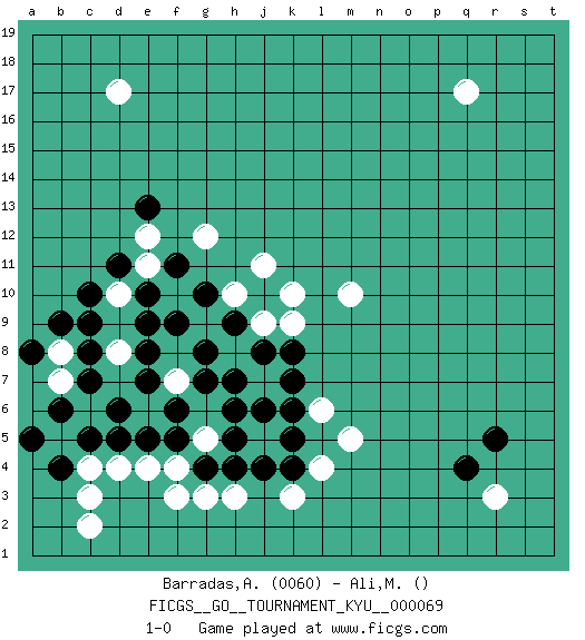 Last move : 1-0 2009 January 1 5:4:2 [Event "FICGS__GO__TOURNAMENT_KYU__000069"] [Site "FICGS"] [Date "2008.09.19"] [Round "1"] [Black "Barradas,Anderson"] [White "Ali,Mohammad Wasif"] [Result "1-0"] [Rating 1 "0060"] 1.q4 q17 2.k6 d17 3.d5 r3 4.r5 c4 5.c7 e6 6.d6 c6 7.c5 c3 8.b6 c2 9.b4 d4 10.e5 f4 11.f5 g5 12.f6 f3 13.e7 f7 14.g7 f8 15.g8 g9 16.f9 b5 17.a5 d8 18.e9 f10 19.e8 g3 20.h6 j7 21.c9 d10 22.c10 e11 23.g10 h8 24.h9 h10 25.j8 k9 26.k7 e4 27.h5 j5 28.j6 l6 29.h4 h3 30.j4 k3 31.k5 l4 32.k4 m5 33.g4 b8 34.b9 b7 35.c8 f7 36.d11 e12 37.f11 g12 38.e10 j11 39.a8 j9 40.k8 k10 41.h7 m10 42.e13 1-0 This go game has been lost on time (started : 2008.09.19 7:53:44) Here are the names of the openings (joseki) played in the four corners : Corner q4 : q4 r3 Hoshi (Hwajeom, Seongjeom, Xingwei`) 4-4 Point. The star or hoshi (4-4) point, emphasizing influence at the potential expense of territory. Corner d4 : d5 c4 Takamoku (Gomok, Gaomu`) 5-4 Point. The takamoku (high) point (5-4). With its emphasis on influence, the 5-4 point complements the 4-4 (hoshi) point in creating an influence-oriented fuseki. Player Black won this Go (weiqi, baduk) game. Follow this game move after move (download)Don't make dango's. (Anonymous) If you ain't just a little scared when you enter a casino, you are either very rich or you haven't studied the games enough. (Pappy)