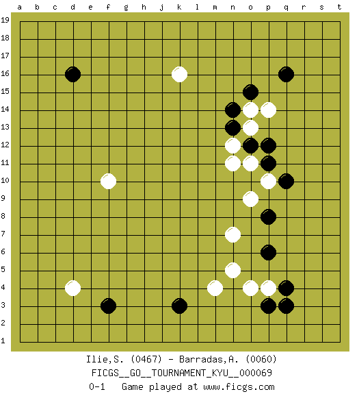 Last move : 0-1 2008 November 22 21:45:21 [Event "FICGS__GO__TOURNAMENT_KYU__000069"] [Site "FICGS"] [Date "2008.09.19"] [Round "1"] [Black "Ilie,Sebastian"] [White "Barradas,Anderson"] [Result "0-1"] [Rating 1 "0467"] [Rating 2 "0060"] 1.q16 d4 2.q3 f10 3.d16 k16 4.f3 p14 5.o15 o9 6.q10 m4 7.k3 p4 8.p3 o4 9.q4 n5 10.p6 n7 11.p8 o11 12.p12 o13 13.o12 n12 14.n13 o14 15.n14 n11 16.p11 p10 0-1 This go game has been lost on time (started : 2008.09.19 7:53:44) Here are the names of the openings (joseki) played in the four corners : Corner d4 : d4 f3 Hoshi (Hwajeom, Seongjeom, Xingwei`) 4-4 Point. The star or hoshi (4-4) point, emphasizing influence at the potential expense of territory. Ikken Kakari (Hankan Keolch'im, Yi Gua`jiao~, 1-Space Low Approach). Black 2 is the standard approach move to the 4-4. Corner q16 : q16 p14 Hoshi (Hwajeom, Seongjeom, Xingwei`) 4-4 Point. The star or hoshi (4-4) point, emphasizing influence at the potential expense of territory. Corner q4 : q3 o9 Komoku (Somok, Xiao~mu`) 3-4 Point. The komoku (3-4) point is the traditional corner enclosure move.. Player White won this Go (weiqi, baduk) game. Follow this game move after move (download)If White takes all four corners, Black should resign; if Black takes all four corners, Black should also resign. (David Kent) All art requires courage. (Anne Tucker)