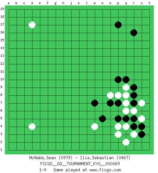 Last move : 1-0 2008 November 20 21:37:28 [Event "FICGS__GO__TOURNAMENT_KYU__000069"] [Site "FICGS"] [Date "2008.09.19"] [Round "1"] [Black "McNabb,Sean"] [White "Ilie,Sebastian"] [Result "1-0"] [Rating 1 "0979"] [Rating 2 "0467"] 1.r16 d17 2.q3 d4 3.p17 r6 4.r9 r3 5.r4 q4 6.q5 p4 7.r5 q7 8.p5 p3 9.s3 q2 10.o7 p8 11.p10 o8 12.p7 q9 13.r8 q8 14.q10 s5 15.s4 s7 16.n5 m4 17.r7 q6 18.m7 1-0 This go game has been lost on time (started : 2008.09.19 7:53:44) Here are the names of the openings (joseki) played in the four corners : Corner q4 : q3 r6 Komoku (Somok, Xiao~mu`) 3-4 Point. The komoku (3-4) point is the traditional corner enclosure move.. Nikken Kakari (Dukan Keolch'im, E`r Gua`jiao~, 2-Space Low Approach). White 2 is used with friendly forces backing it up. Its purpose is to prevent a pincer. Locally it results in a loss, but may be appropriate fuseki strategy. It was popular in the late 1950s and early 1960s, but is not seen often nowadays, having been replaced by the one-space high approach, with which it has points in common. Player Black won this Go (weiqi, baduk) game. Follow this game move after move (download)When you study joseki, you lose two stones in strength. (Anonymous) A bird doesn't sing because it has an answer, it sings because it has a song. (Maya Angelou)