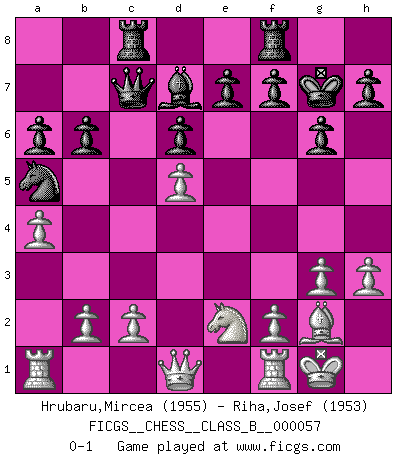 Last move : 0-1 2008 December 15 2:40:41 [Event "FICGS__CHESS__CLASS_B__000057"] [Site "FICGS"] [Date "2008.09.23"] [Round "1"] [White "Hrubaru,Mircea"] [Black "Riha,Josef"] [Result "0-1"] [WhiteElo "1955"] [BlackElo "1953"] 1.e4 c5 2.Nf3 d6 3.d4 cxd4 4.Nxd4 Nf6 5.Nc3 g6 6.g3 Nc6 7.Nde2 Bg7 8.Bg2 O-O 9.O-O Bd7 10.h3 Rc8 11.a4 a6 12.Nd5 b6 13.Be3 Nxd5 14.exd5 Na5 15.Bd4 Qc7 16.Bxg7 Kxg7 0-1 Sicilian : Dragon variation Kingside Castling by player Black (move 8) Kingside Castling by player White (move 9) Player Black won this chess game. Follow this game move after move (download)In the perfect Chess combination as in a first-rate short story, the whole plot and counter-plot should lead up to a striking finale, the interest not being allayed until the very last moment. (Yates and Winter) Ich bin Weltmeister und muß mit niemandem irgend etwas diskutieren. (Viswanathan Anand) Te sientas frente a un tablero y repentinamente tu corazón brinca. Tu mano tiembla al tomar una pieza y moverla. Pero lo que el Ajedrez te enseña es que tu debes permanecer ahí con calma y pensar de que si realmente es una buena idea o de que si hay otras ideas mejores. (Stanley Kubrick) RxDa4 pat (...) Wisdom doesn't necessarily come with age. Sometimes age just shows up all by itself. (Tom Wilson)