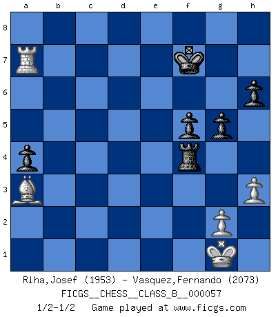 Last move : 1/2-1/2 2009 January 9 22:11:44 [Event "FICGS__CHESS__CLASS_B__000057"] [Site "FICGS"] [Date "2008.09.23"] [Round "1"] [White "Riha,Josef"] [Black "Vasquez,Fernando"] [Result "1/2-1/2"] [WhiteElo "1953"] [BlackElo "2073"] 1.e4 e5 2.Nf3 Nf6 3.Nxe5 d6 4.Nf3 Nxe4 5.d4 d5 6.Bd3 Nc6 7.O-O Be7 8.c4 Nb4 9.Be2 O-O 10.Nc3 Be6 11.Be3 Bf5 12.Rc1 dxc4 13.Bxc4 Nxc3 14.bxc3 Nd5 15.Qb3 c6 16.Qxb7 Qb6 17.Qa6 Qxa6 18.Bxa6 Ba3 19.Rce1 Nxc3 20.Ne5 Rae8 21.Bd2 Ne4 22.Ba5 Nf6 23.Nxc6 Be4 24.Re3 Bd6 25.Nb4 Ng4 26.Rh3 Bf5 27.a3 Re6 28.Bc4 R6e8 29.Bb5 Rb8 30.a4 Rfc8 31.Nc6 a6 32.Nxb8 axb5 33.Na6 bxa4 34.Re1 f6 35.Bb4 Nxf2 36.Rf3 Nd3 37.Bxd6 Nxe1 38.Rxf5 Rc4 39.Ra5 Nd3 40.Ba3 Rxd4 41.Nc5 Nxc5 42.Bxc5 Rc4 43.Ba3 Rf4 44.h3 h6 45.Ra8+ Kf7 46.Ra7+ Kg8 47.Ra5 g5 48.Ra7 f5 49.Ra5 Kf7 50.Ra7+ 1/2-1/2 Petrov : Classical attack Kingside Castling by player White (move 7) Kingside Castling by player Black (move 9) This chess game ended in a draw. Follow this game move after move (download)I don't believe in psychology. I believe in good moves. (Bobby Fischer) Wenn Schach ein enormer Dschungel ist, der seine Myriaden von Geheimnissen nicht preisgeben will, dann sind Computer die Kettensägen einer gewaltigen ökologisch unsensiblen Nutzholzfirma. (Nigel Short) ¿Que sería del Ajedrez sin errores graciosos?. (Kurt Richter) Seul un grand joueur sait à quel point il joue faiblement. (Xavier Tartacover) Never risk one's whole fortune unless supported by one's entire army. (Niccolo Machiavelli)