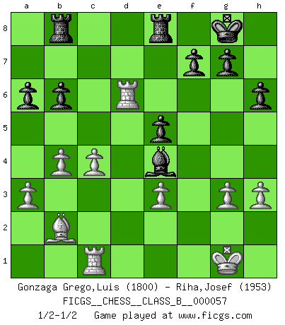 Last move : 1/2-1/2 2008 October 4 19:3:38 [Event "FICGS__CHESS__CLASS_B__000057"] [Site "FICGS"] [Date "2008.09.23"] [Round "1"] [White "Gonzaga Grego,Luis"] [Black "Riha,Josef"] [Result "1/2-1/2"] [WhiteElo "1800"] [BlackElo "1953"] 1.c4 e6 2.Nf3 Nf6 3.Nc3 c5 4.g3 b6 5.Bg2 Bb7 6.O-O d6 7.b3 Be7 8.d4 cxd4 9.Qxd4 O-O 10.Rd1 Nbd7 11.Bb2 a6 12.e4 Qc8 13.Qe3 h6 14.Rac1 Rb8 15.Nd4 Qc5 16.h3 Rfe8 17.a3 e5 18.Nf5 Qxe3 19.Nxe3 Nc5 20.b4 Ncxe4 21.Ncd5 Bf8 22.Nf5 Nxd5 23.Bxe4 Ne3 24.fxe3 Bxe4 25.Nxd6 Bxd6 26.Rxd6 1/2-1/2 English Opening Kingside Castling by player White (move 6) Kingside Castling by player Black (move 9) This chess game ended in a draw. Follow this game move after move (download)Up to this point White has been following well-known analysis. But now he makes a fatal error: he begins to use his own head. (Siegbert Tarrasch) Unter Putin wird alles Geld aus Russland wie von einem Staubsauger nach Moskau umgeleitet, das ist wie ein schwarzes Loch. (Garry Kasparov) Alguna parte de un error es siempre correcto. (Savielly Tartakover) Lorsque vous vous retrouvez devant une position atroce, ne tendez pas un ultime piège dérisoire avec l'intention d'abandonner si l'adversaire le déjoue ! Faites-vous plutôt un devoir de résister comme si votre vie en dépendait. Jouez le coup qui vous déplairait au centuple si vous étiez dans la peau de votre tortionnaire ! There's always a bigger fish. (Qui-Gon Jinn in Star Wars ep.1)