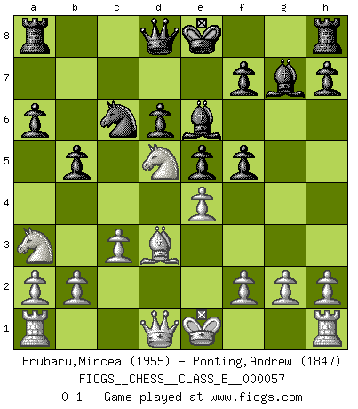 Last move : 0-1 2008 December 18 14:55:20 [Event "FICGS__CHESS__CLASS_B__000057"] [Site "FICGS"] [Date "2008.09.23"] [Round "1"] [White "Hrubaru,Mircea"] [Black "Ponting,Andrew"] [Result "0-1"] [WhiteElo "1955"] [BlackElo "1847"] 1.e4 c5 2.Nf3 Nc6 3.d4 cxd4 4.Nxd4 Nf6 5.Nc3 e5 6.Ndb5 d6 7.Bg5 a6 8.Na3 b5 9.Bxf6 gxf6 10.Nd5 f5 11.c3 Bg7 12.Bd3 Be6 0-1 Sicilian : Pelikan (Lasker/Sveshnikov) variation Player Black won this chess game. Follow this game move after move (download)The tactician must know what to do whenever something needs doing; the strategist must know what to do when nothing needs doing. (Savielly Tartakover) Fischer machte Schach einfach zu einer aufregenden Sache, wann immer er sich ans Brett setzte. (Raymond Keene) Vive, pierde y aprende al observar a tu oponente como gana. (Amber Steenbock) Les Echecs ne sont pas pour les âmes timides. Ils requièrent un homme entier, qui ne s'arrête pas aveuglément à ce qui a été déjà établi, mais qui tente individuellement de sonder les profondeurs du jeu. (W. Steinitz) I couldn't make any sense out of what this particular thread is about. It sounds like R2 D2 computer speaking. A space fight ?!? Some 'command' problems in Moscow ? Some killers & narcotic addicts attacking some game & a god wannabe ?? (Dinesh De Silva, lost in a russian conflict in FICGS forum)