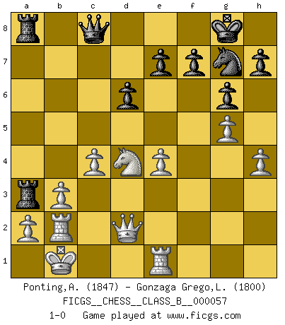 Last move : 1-0 2008 November 9 2:58:6 [Event "FICGS__CHESS__CLASS_B__000057"] [Site "FICGS"] [Date "2008.09.23"] [Round "1"] [White "Ponting,Andrew"] [Black "Gonzaga Grego,Luis"] [Result "1-0"] [WhiteElo "1847"] [BlackElo "1800"] 1.e4 c5 2.Nf3 d6 3.d4 cxd4 4.Nxd4 Nf6 5.Nc3 g6 6.Be3 Bg7 7.f3 O-O 8.Qd2 Nc6 9.Bc4 Bd7 10.O-O-O Rc8 11.Bb3 Ne5 12.Kb1 a6 13.g4 b5 14.g5 b4 15.Na4 Nh5 16.Qxb4 Rb8 17.Qe1 a5 18.Nc3 a4 19.Bxa4 Bxa4 20.Nxa4 Qc7 21.b3 Ra8 22.Nb2 Nxf3 23.Nxf3 Bxb2 24.c4 Bg7 25.Bd4 Rfb8 26.Qc3 Ra4 27.Rc1 Ra5 28.Bxg7 Nxg7 29.h4 Rba8 30.Rc2 Qa7 31.Qd2 Ra3 32.Rb2 Qb7 33.Re1 Qc8 34.Nd4 1-0 Sicilian : Dragon, Yugoslav attack, 7...O-O Kingside Castling by player Black (move 7) Queenside Castling by player White (move 10) Player White won this chess game. Follow this game move after move (download)If I win a tournament, I win it by myself. I do the playing. Nobody helps me. (Bobby Fischer) Ich brauche nur einen Blick auf das Schachbrett zu werfen, und weiß schon, was in der Stellung steckt, was geschehen kann und was geschehen wird. Alle übrigen suchen und prüfen, ich aber weiß es! (José Raúl Capablanca) Mis oponentes también hacen buenas movidas. A veces yo no tomo esas cosas en consideración. (Bobby Fischer) Le joueur d'Echecs qui veut atteindre le top est obligé de développer son propre credo créatif. Alexeï Stepanovicth Souétine. Il est facile d'écrire des livres ! Ce qui est difficile, c'est de jouer ! (Alexeï Stepanovicth Souétine) Creativity is allowing yourself to make mistakes. Art is knowing which ones to keep. (Scott Adams)
