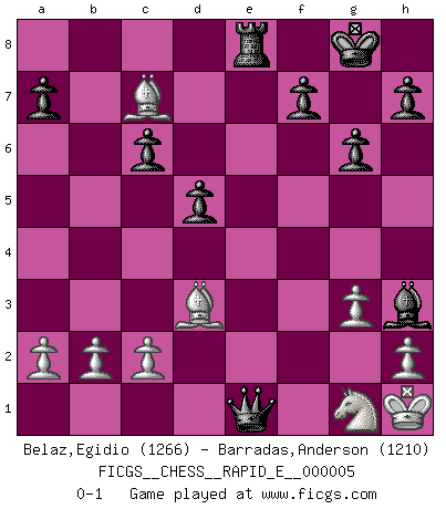 Last move : 0-1 2008 October 17 16:34:4 [Event "FICGS__CHESS__RAPID_E__000005"] [Site "FICGS"] [Date "2008.09.23"] [Round "1"] [White "Belaz,Egidio"] [Black "Barradas,Anderson"] [Result "0-1"] [WhiteElo "1266"] [BlackElo "1210"] 1.e4 e5 2.f4 exf4 3.Nf3 Be7 4.Bc4 Nc6 5.O-O Nf6 6.d4 Nxe4 7.Bxf4 O-O 8.d5 Bc5+ 9.Kh1 Nf2+ 10.Rxf2 Bxf2 11.dxc6 bxc6 12.Nc3 d5 13.Bd3 Re8 14.Ng5 Re1+ 15.Qxe1 Bxe1 16.Rxe1 g6 17.Bg3 Qxg5 18.Bxc7 Bh3 19.g3 Qd2 20.Ne2 Qxe1+ 21.Ng1 Re8 0-1 KGA : Cunningham defense Kingside Castling by player White (move 5) Kingside Castling by player Black (move 7) Player Black won this chess game. Follow this game move after move (download)Chess mastery essentially consists of analyzing Chess positions accurately. (Mikhail Botvinnik) In Buenos Aires ist es nicht mein vorrangiges Ziel ein starkes Turnier zu organisieren, sondern ein Turnier für Gentlemen. Ich würde nie Kamsky einladen. Ich mag keine Probleme. (Miguel Najdorf) Una clavada es mas poderosa que una espada. (Fred Reinfeld) Pour se monter efficace, un Cavalier a besoin d'avant-postes ! Les Cavaliers font les meilleurs bloqueurs de pions passés. The real voyage of discovery consists not in seeking new lands but in seeing with new eyes. (Marcel Proust)