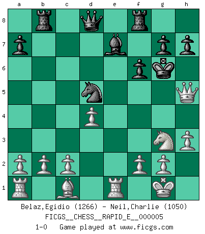 Last move : 1-0 2008 October 18 23:10:56 [Event "FICGS__CHESS__RAPID_E__000005"] [Site "FICGS"] [Date "2008.09.23"] [Round "1"] [White "Belaz,Egidio"] [Black "Neil,Charlie"] [Result "1-0"] [WhiteElo "1266"] [BlackElo "1050"] 1.e4 c6 2.Bc4 d5 3.exd5 cxd5 4.Bd3 e5 5.Nc3 Nf6 6.Nf3 Bg4 7.O-O e4 8.Bb5+ Nc6 9.Re1 Be7 10.h3 Bh5 11.Bxc6+ Kf8 12.Bxb7 Rb8 13.Bxd5 Nxd5 14.Nxe4 f6 15.Ng3 Bg6 16.d4 Kf7 17.Nh4 Rf8 18.Nxg6 Kxg6 19.Qh5+ 1-0 Caro-Kann : Hillbilly attack Kingside Castling by player White (move 7) Player White won this chess game. Follow this game move after move (download)Don't even mention losing to me. I can't stand to think of it. (Bobby Fischer) Smyslow ist ein Beweis dafür, dass ich noch zehn Jahre spielen kann! [der 75 jährige über den 85 jährigen] (Viktor Kortschnoi) Fischer sacrificó virtualmente todo lo que la mayoría de nosotros los 'debiles' (término que él usa) valoramos, respetamos y apreciamos por el amor de un astuto, a menudo hermoso tablero de juego, por el privilegio ambivalente de ser su mas grande maestro. (Paul Kollar) Donnez-moi un Cavalier en 6e et je gagnerais toutes mes parties. (Steinitz) Hold em is to stud what chess is to checkers. (Johnny Moss)