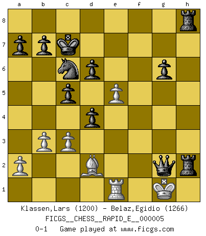 Last move : 0-1 2008 December 25 15:48:56 [Event "FICGS__CHESS__RAPID_E__000005"] [Site "FICGS"] [Date "2008.09.23"] [Round "1"] [White "Klassen,Lars"] [Black "Belaz,Egidio"] [Result "0-1"] [WhiteElo "1200"] [BlackElo "1266"] 1.d4 e6 2.e4 Nf6 3.Nc3 Be7 4.Nf3 O-O 5.e5 Nd5 6.Bd2 c6 7.Bd3 Nxc3 8.Bxc3 c5 9.d5 exd5 10.O-O d4 11.Bd2 Nc6 12.g3 d6 13.Re1 Bg4 14.Bf4 Re8 15.h3 Bxh3 16.e6 fxe6 17.Bxh7+ Kxh7 18.Ng5+ Bxg5 19.Qh5+ Bh6 20.Qxh3 e5 21.Bd2 Qf6 22.Re4 Kg8 23.Bxh6 g6 24.Rg4 Kf7 25.Bg5 Rh8 26.Qg2 Qe6 27.Qf3+ Ke8 28.Re1 Kd7 29.b3 Raf8 30.Qe4 Kc7 31.Bd2 Rfg8 32.c3 Rh5 33.f4 Qxg4 34.Kg2 Rgh8 35.fxe5 Rh2+ 36.Kg1 Qxg3+ 37.Qg2 Qxg2+ 0-1 This chess game has been lost on time (started : 2008.09.23 17:13:44) Queen's pawn Kingside Castling by player Black (move 4) Kingside Castling by player White (move 10) Player Black won this chess game. Follow this game move after move (download)The tactician knows what to do when there is something to do; whereas the strategian knows what to do when there is nothing to do. (Gerald Abrahams) Mit sehr nachdenklichem Gesicht schreitet Bobby durch den Turniersaal. Was ist passiert?, fragt Lombardy. Ich stehe schlecht, antwortet Fischer. Lombardy: Dann biete doch einfach Remis an. Fischer: So schlecht stehe ich nun auch wieder nicht! (Robert James Fischer) La táctica fluye a partir de una posición superior. (Bobby Fischer) Les Echecs ont trois composantes : le temps, l'espace et le matériel en dernier. (Mikhail Tal) Go and wake up your luck. (Persian saying)