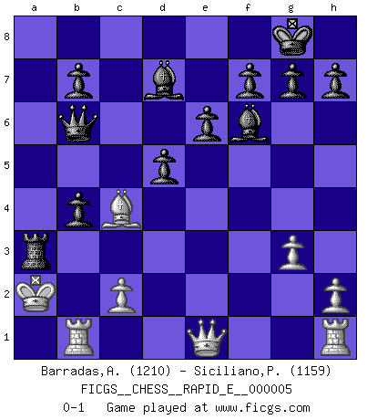 Last move : 0-1 2008 October 22 15:39:4 [Event "FICGS__CHESS__RAPID_E__000005"] [Site "FICGS"] [Date "2008.09.23"] [Round "1"] [White "Barradas,Anderson"] [Black "Siciliano,Pablo"] [Result "0-1"] [WhiteElo "1210"] [BlackElo "1159"] 1.e4 c5 2.Nf3 e6 3.d4 cxd4 4.Nxd4 Bc5 5.Be3 Qb6 6.Nc3 Nc6 7.Na4 Qa5+ 8.Nc3 Bb4 9.Bd2 Nxd4 10.a3 Be7 11.Ne2 Qb6 12.b4 Nf6 13.e5 Ng4 14.Nxd4 Qxd4 15.Ke2 Qxf2+ 16.Kd3 Nxe5+ 17.Kc3 Bf6 18.Kb3 O-O 19.Rb1 d5 20.Qe2 Qb6 21.g3 Bd7 22.Qe1 Rfc8 23.Bc3 Rxc3+ 24.Qxc3 Nc4 25.Qe1 a5 26.Ka2 axb4 27.Bxc4 Rxa3+ 0-1 Sicilian defense Kingside Castling by player Black (move 18) Player Black won this chess game. Follow this game move after move (download)Chess is in its essence a game, in its form an art, and in its execution a science. (Baron Tassilo) Gewinnen beim Schach fördert das Selbstvertrauen. Beim Sex spüre ich sowas nicht... (Garry Kasparov) El Ajedrez se juega con la mente... ¡no con las manos!. (Renaud y Kahn) On croit qu'il y a plus de mauvais joueurs que de bons joueurs, c'est faux : Il y a autant de joueurs qui gagnent que de joueurs qui perdent. (Philippe Geluck) Happy endings are just stories that haven't finished yet. (Jane Smith in Mr & Mrs Smith)