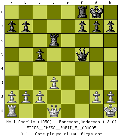 Last move : 0-1 2008 October 21 23:21:6 [Event "FICGS__CHESS__RAPID_E__000005"] [Site "FICGS"] [Date "2008.09.23"] [Round "1"] [White "Neil,Charlie"] [Black "Barradas,Anderson"] [Result "0-1"] [WhiteElo "1050"] [BlackElo "1210"] 1.e4 c5 2.Nc3 d6 3.f4 e5 4.Nf3 Bg4 5.Be2 Nf6 6.O-O Nc6 7.fxe5 Bxf3 8.Bxf3 Nxe5 9.d3 Nxf3+ 10.Rxf3 Be7 11.Bf4 O-O 12.e5 dxe5 13.Bxe5 Ng4 14.Bf4 Qd4+ 15.Kh1 Nf2+ 16.Rxf2 Qxf2 17.Bg3 Qf5 18.Ne4 Rad8 19.Nd6 Bxd6 20.Bxd6 Rxd6 0-1 Sicilian : Closed Kingside Castling by player White (move 6) Kingside Castling by player Black (move 11) Player Black won this chess game. Follow this game move after move (download)I thought the most common mistake [in chess] was the first one: Learning the game :P (Garvin Gray, FICGS forum) Nach Morphy wurde nichts neues mehr in der Behandlung offener Positionen gefunden. (Mikhail Moiseyevich Botvinik) Si el Ajedrez es una ciencia, es la mas inexacta. Si el Ajedrez es un arte, es demasiado inexacto para ser visto como tal. Si el Ajedrez es un deporte, es demasiado esotérico. Si el Ajedrez es un juego, es demasiado exigente para ser solo un juego. Si el Ajedrez es una aventura, es una muy demandante. Si el Ajedrez es una pasión, es una muy gratificante. Si el Ajedrez es la vida, es una muy triste. (Anónimo) On entre au jeu d'Echecs comme on entre en Religion. Pour le joueur d'Echecs, la partie d'Echecs c'est l'office, la messe, le défilé du 1er Mai, le dépôt de gerbe au Monument aux Morts. C'est un drame sacré. (Michel Roos) Computers are like Old Testament gods; lots of rules and no mercy. (Joseph Campbell)