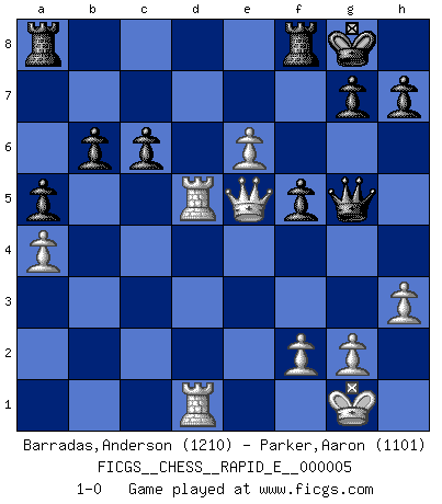 Last move : 1-0 2008 October 7 16:51:42 [Event "FICGS__CHESS__RAPID_E__000005"] [Site "FICGS"] [Date "2008.09.23"] [Round "1"] [White "Barradas,Anderson"] [Black "Parker,Aaron"] [Result "1-0"] [WhiteElo "1210"] [BlackElo "1101"] 1.e4 e6 2.d4 d5 3.e5 a6 4.Nf3 Be7 5.Nc3 Nc6 6.Bd3 Nb4 7.O-O Nxd3 8.Qxd3 Nh6 9.h3 Nf5 10.Bd2 Bd7 11.Bg5 Bxg5 12.Ne2 Be7 13.b3 Bb5 14.c4 dxc4 15.bxc4 Bc6 16.Nf4 O-O 17.a4 b6 18.d5 Bb7 19.Nd4 Nxd4 20.Qxd4 Bc5 21.Qe4 f5 22.Qe2 Qh4 23.Nxe6 Rf7 24.Rad1 a5 25.Rb1 Bb4 26.Qe3 Qxc4 27.Ng5 R7f8 28.Rfd1 Bxd5 29.e6 Bc5 30.Qe5 c6 31.Rbc1 Qh4 32.Rxc5 Qxg5 33.Rcxd5 1-0 French : Advance variation Kingside Castling by player White (move 7) Kingside Castling by player Black (move 16) Player White won this chess game. Follow this game move after move (download)You can only get good at Chess if you love the game. (Bobby Fischer) Wenn du gegen Bobby spielst, ist es keine Frage von gewinnen oder verlieren. Es ist eine Frage des Überlebens. (Boris Vassilievich Spassky) El jugador de combinación piensa hacia adelante; comienza de la posición dada y trabaja las movidas contundentes en su mente. (Emanuel Lasker) Comme les marins qui ont mille raisons différentes d'aller en mer, les joueurs d'échecs en ont tout autant avant de s'installer devant une table et jouer... (Vincent Bertignac, philosophe) The difference between perseverance and obstinacy is that one comes from a strong will, and the other from a strong won't. (Henry Ward Beecher)