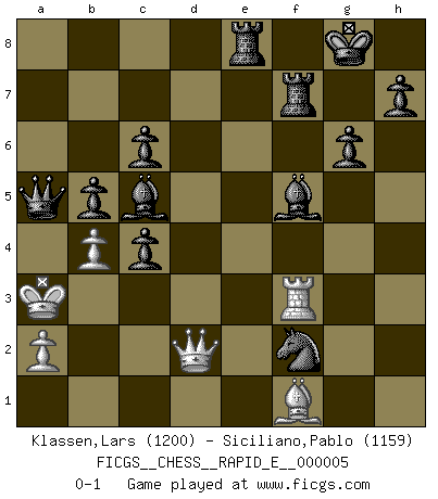 Last move : 0-1 2008 December 23 15:32:31 [Event "FICGS__CHESS__RAPID_E__000005"] [Site "FICGS"] [Date "2008.09.23"] [Round "1"] [White "Klassen,Lars"] [Black "Siciliano,Pablo"] [Result "0-1"] [WhiteElo "1200"] [BlackElo "1159"] 1.Nf3 d5 2.d4 Nf6 3.Bf4 c6 4.Ne5 Qb6 5.b3 e6 6.h3 Nbd7 7.e3 Be7 8.g4 Nxe5 9.Bxe5 O-O 10.g5 Nd7 11.h4 f6 12.Bf4 e5 13.Bg3 exd4 14.exd4 fxg5 15.hxg5 Bxg5 16.Qd3 g6 17.Nc3 Bf6 18.O-O-O Bg7 19.Qe3 Nf6 20.Kb2 Bf5 21.Na4 Qa5 22.c4 Rae8 23.Qc1 Ne4 24.Rd3 Nxf2 25.Rf3 Bxd4+ 26.Ka3 Nxh1 27.Bd6 Rf7 28.Bb4 Qd8 29.Bg2 Nf2 30.Qd2 dxc4 31.Bf1 b5 32.Nc5 a5 33.Bxa5 Bxc5+ 34.b4 Qxa5+ 0-1 This chess game has been lost on time (started : 2008.09.23 17:13:44) Reti Opening Kingside Castling by player Black (move 9) Queenside Castling by player White (move 18) Player Black won this chess game. Follow this game move after move (download)Chess is life. (Bobby Fischer) Wenn Schach ein enormer Dschungel ist, der seine Myriaden von Geheimnissen nicht preisgeben will, dann sind Computer die Kettensägen einer gewaltigen ökologisch unsensiblen Nutzholzfirma. (Nigel Short) Yo nunca en mi vida he jugado la Defensa Francesa, que viene siendo la más aburrida de todas las Aperturas. (Wilhelm Steinitz) Fischer est le meilleur joueur du monde et Karpov n'est qu'un joueur de bistrot. (Garry Kasparov, agé de 16 ans) Knowledge rests not upon truth alone, but upon error also. (Carl G. Jung)