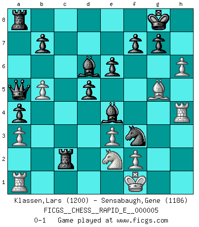 Last move : 0-1 2009 January 4 17:29:52 [Event "FICGS__CHESS__RAPID_E__000005"] [Site "FICGS"] [Date "2008.09.23"] [Round "1"] [White "Klassen,Lars"] [Black "Sensabaugh,Gene"] [Result "0-1"] [WhiteElo "1200"] [BlackElo "1186"] 1.Nc3 d5 2.d4 Nf6 3.Bf4 c6 4.b4 Bf5 5.e3 e6 6.a3 Bd6 7.Bg5 Nbd7 8.h3 O-O 9.g4 Bg6 10.h4 h6 11.h5 Bh7 12.Bh4 a5 13.b5 c5 14.Nf3 cxd4 15.Nxd4 a4 16.g5 hxg5 17.Bxg5 Qa5 18.Qd2 Rfc8 19.Nde2 Ne5 20.Bg2 Nc4 21.Kf1 Nxd2+ 22.Kg1 Rxc3 23.h6 Nfe4 24.Bxe4 Bxe4 25.Rh4 Nf3+ 26.Kf1 Rxc2 0-1 This chess game has been lost on time (started : 2008.09.23 17:13:44) Dunst (Sleipner, Heinrichsen) Opening Kingside Castling by player Black (move 8) Player Black won this chess game. Follow this game move after move (download)Kasparov : J'adoube , Ivanchuk : S'il vous plaît ! (Garry Kasparov & Vassily Ivanchuk, Linares 1997) Wie ich sie so einen nach dem anderen nieder mähte wurde meine Überlegenheit offensichtlich. (José Raúl Capablanca) El Ajedrez es una hermosa aventura. (Bent Larsen) Aux échecs, les retours au sommet sont rares : les dommages psychologiques consécutifs à une défaite sont trop sévères. (Daily Telegraph) See no evil, hear no evil, speak no evil. (The 3 monkeys)