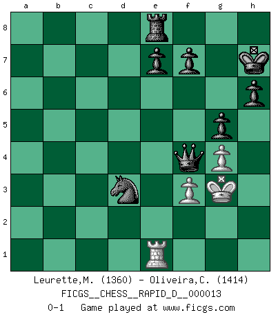Last move : 0-1 2008 December 1 10:26:16 [Event "FICGS__CHESS__RAPID_D__000013"] [Site "FICGS"] [Date "2008.09.24"] [Round "1"] [White "Leurette,Marc-Antoine"] [Black "Oliveira,Carlos"] [Result "0-1"] [WhiteElo "1360"] [BlackElo "1414"] 1.e4 c6 2.d4 g6 3.Nf3 Bg7 4.Nc3 d5 5.exd5 cxd5 6.Bb5+ Nc6 7.O-O Nf6 8.Ne5 Bd7 9.b3 O-O 10.Be3 Rc8 11.Qd3 Ne4 12.Nxe4 dxe4 13.Qxe4 Nxe5 14.Bxd7 Nxd7 15.c4 Nf6 16.Qf3 Qc7 17.Bg5 h6 18.Bf4 Qb6 19.Qe3 Kh7 20.Rad1 Rfe8 21.d5 Qa5 22.Rd2 b5 23.Qd4 bxc4 24.bxc4 Nh5 25.Be3 Bxd4 26.Rxd4 Qxa2 27.h3 Rxc4 28.g4 Rxd4 29.Bxd4 Qxd5 30.Bxa7 Nf4 31.f3 Nxh3+ 32.Kh2 Nf4 33.Kg3 g5 34.Be3 Qe5 35.Re1 Nd3 36.Bf4 Qxf4+ 0-1 Caro-Kann defense Kingside Castling by player White (move 7) Kingside Castling by player Black (move 9) Player Black won this chess game. Follow this game move after move (download)We don't really know how the game was invented, though there are suspicions. As soon as we discover the culprits, we'll let you know. (Bruce Pandolfini) Bobby Fischer ist kein Vorbild für die heutige Jugend. (Viktor Kortschnoi) ¿Esta Bobby Fischer algo cuerdo?. (Salo Flohr) Dans le domaine de la peinture, de la gravure et de la sculpture, dès la première décennie de notre siècle, les artistes abandonnent la représentation de la partie d'échecs pour se concentrer sur les pièces, sur les échiquiers et sur toutes les variations auxquelles les unes et les autres peuvent donner lieu. On passe en quelque sorte d'un thème social à un thème musical (au sens de la musica médiévale, c'est-à-dire d'une notion qui inclue le rythme, l'harmonie, la construction et la déconstruction, etc.). Graphiquement et picturalement, l'échiquier apparaît comme une structure ouverte, dynamique, d'une richesse infinie, autorisant toutes les combinatoires et débouchant sur des mouvements et des rythmes de nature exponentielle. (Michel Pastoureau) It's not the will to win, but the will to prepare to win that makes the difference. (Bear Bryant)