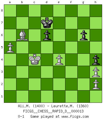 Last move : 0-1 2008 December 24 3:36:52 [Event "FICGS__CHESS__RAPID_D__000013"] [Site "FICGS"] [Date "2008.09.24"] [Round "1"] [White "Ali,Mohammad Wasif"] [Black "Leurette,Marc-Antoine"] [Result "0-1"] [WhiteElo "1400"] [BlackElo "1360"] 1.c4 e5 2.Nc3 Nf6 3.Nf3 Nc6 4.d4 e4 5.Ng5 Qe7 6.d5 Ne5 7.e3 d6 8.Ngxe4 Bg4 9.Be2 Bxe2 10.Qxe2 c6 11.Nxf6+ Qxf6 12.dxc6 bxc6 13.f4 Ng6 14.Qf3 Rc8 15.O-O Be7 16.Qh3 O-O 17.e4 Qd4+ 18.Be3 Qxc4 19.Rad1 Rb8 20.Rd4 Qe6 21.f5 Qd7 22.fxg6 Qxh3 23.gxf7+ Rxf7 24.gxh3 Rxb2 25.Rxf7 Kxf7 26.Ra4 Rb7 27.Rxa7 Rxa7 28.Bxa7 Bf6 29.Ne2 g6 30.a4 Bd8 31.Nd4 c5 32.Nc6 Ke8 33.Nxd8 Kxd8 34.a5 c4 35.Kf1 h5 36.Ke1 Kc7 37.Kd2 Kb7 38.Bb6 h4 39.Kc3 Kc6 40.Kxc4 Kd7 0-1 This chess game has been lost on time (started : 2008.09.24 5:59:52) English Opening Kingside Castling by player White (move 15) Kingside Castling by player Black (move 16) 10 pieces endgame at move 40 : White KBPPPP , Black KPPP WHITE : King + 1 Bishop 4 Pawns BLACK : King + 3 Pawns Player Black won this chess game. Follow this game move after move (download)If you aren't afraid of Spassky, then I have removed the element of money. (Jim Slater) Im Schach nämlich geht es darum, daß Ich des Gegners klein zu kriegen, sein Ego zu zerbrechen und zu zermahlen, seine Selbstachtung zu zertreten und zu verscharren und seine ganze mißachtenswerte sogenannte Persönlichkeit ein für alle Mal tot zu hacken und zu zerstampfen und dadurch die menschliche Gesellschaft von einer stinkenden Pestbeule zu befreien. Es ist ein königliches Spiel. (Robert James Fischer) Siempre es mucho mejor sacrificar las piezas de tu oponente. (Savielly Tartakover) Je fais ceci parce que dans cinquante coups j'obtiendrai cela; je m'appelle Mikhail Moisevitch Botvinnik. (Botvinnik) Plans are ideas that never come to fruition. (Daniel Parmet)