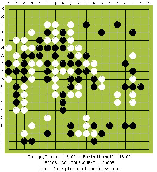 Last move : 1-0 2006 September 21 18:10:2 [Event "FICGS__GO__TOURNAMENT__000008"] [Site "FICGS"] [Date "2006.08.12"] [Round "1"] [Black "Tamayo,Thomas"] [White "Ruzin,Mikhail"] [Result "1-0"] [Rating 1 "1900"] [Rating 2 "1800"] 1.r16 d4 2.q4 d16 3.p17 r10 4.c10 r13 5.f3 c6 6.c13 f17 7.d2 c3 8.j3 r7 9.o4 c15 10.l17 j17 11.r4 m3 12.n3 k3 13.m4 l4 14.m2 l3 15.j4 l5 16.c2 f5 17.b8 c8 18.b7 c9 19.b9 d10 20.c11 d11 21.h6 c7 22.q9 p7 23.r9 r8 24.s9 p8 25.r11 b12 26.c12 b13 27.b14 c14 28.b11 b15 29.a12 a14 30.q12 a10 31.a11 b6 32.e13 g12 33.e15 j15 34.f12 g11 35.g13 h13 36.f11 g10 37.f10 g9 38.g14 f15 39.f14 d14 40.e14 d12 41.d13 e12 42.f16 g15 43.h15 g16 44.h16 g17 45.h14 j16 46.j13 j14 47.h12 k13 48.k12 l12 49.l13 k14 50.l11 m12 51.k11 j11 52.j10 h11 53.j12 m11 54.m10 n10 55.m9 n9 56.n16 k9 57.j9 k8 58.k10 j8 59.h8 g8 60.h7 1-0 Here are the names of the openings (joseki) played in the four corners : Corner d4 : d4 f3 Hoshi (Hwajeom, Seongjeom, Xingwei`) 4-4 Point. The star or hoshi (4-4) point, emphasizing influence at the potential expense of territory. Ikken Kakari (Hankan Keolch'im, Yi Gua`jiao~, 1-Space Low Approach). Black 2 is the standard approach move to the 4-4. Corner d16 : d16 c13 Hoshi (Hwajeom, Seongjeom, Xingwei`) 4-4 Point. The star or hoshi (4-4) point, emphasizing influence at the potential expense of territory. Nikken Kakari (Dukan Keolch'im, E`r Gua`jiao~, 2-Space Low Approach). White typically answers by 7-3 or 3-5 (which is not joseki). Corner q4 : q4 r7 Hoshi (Hwajeom, Seongjeom, Xingwei`) 4-4 Point. The star or hoshi (4-4) point, emphasizing influence at the potential expense of territory. Nikken Kakari (Dukan Keolch'im, E`r Gua`jiao~, 2-Space Low Approach). Black typically answers by 7-3 or 3-5 (which is not joseki). Player Black won this Go (weiqi, baduk) game. Follow this game move after move (download)To emphasize the lack of determination in his moves, one speaks of chance. (Pierre Audouard) You lose, general Kenobi. (General Grievous in Star Wars ep.3)