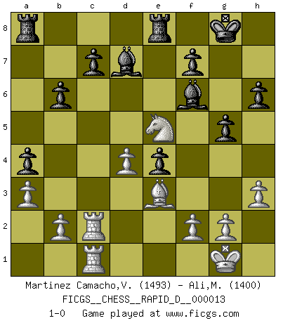 Last move : 1-0 2008 December 17 14:54:44 [Event "FICGS__CHESS__RAPID_D__000013"] [Site "FICGS"] [Date "2008.09.24"] [Round "1"] [White "Martinez Camacho,Victor Hugo"] [Black "Ali,Mohammad Wasif"] [Result "1-0"] [WhiteElo "1493"] [BlackElo "1400"] 1.e4 e5 2.Nf3 Nf6 3.Nxe5 d6 4.Nf3 Nxe4 5.d4 d5 6.Bd3 Nc6 7.h3 Be7 8.O-O Bf5 9.Nc3 O-O 10.Be3 Bf6 11.Bxe4 dxe4 12.Nd2 Re8 13.Nb3 b6 14.Qd2 Nb4 15.a3 Nd5 16.Nxd5 Qxd5 17.Rad1 a5 18.Qc1 a4 19.c4 Qb7 20.Na1 Qa6 21.Nc2 Qxc4 22.Nb4 Qxc1 23.Rxc1 Rac8 24.Nc6 Ra8 25.Rfd1 g5 26.Rc2 h6 27.Rdc1 Bd7 28.Ne5 1-0 This chess game has been lost on time (started : 2008.09.24 5:59:52) Petrov : Classical attack Kingside Castling by player White (move 8) Kingside Castling by player Black (move 9) Player White won this chess game. Follow this game move after move (download)The isolated Pawn casts gloom over the entire chessboard. (Aaron Nimzovich) Der Verteidiger gebe der Gewalt nach, aber nur der Gewalt. Er schaffe sich nicht freiwillig, etwa aus Blindheit oder aus Schrecken, irgendwelche Schwächen. Er lasse sich nicht bluffen. (Emanuel Lasker) El juego del Ajedrez no es solamente una diversión quieta; algunas cualidades muy valuables de la mente se pueden adquirir y cultivar con el, como convertirlos en habitos disponibles para toda ocasión; ya que la vida es algo así como el Ajedrez. (Benjamin Franklin) Horreur, mais aussi harmonie suprême : qu'y avait-il en effet au monde en dehors des échecs ? Le brouillard, l'inconnu, le non-être... (Vladimir Nabokov) Perception is reality. (Immanuel Kant)