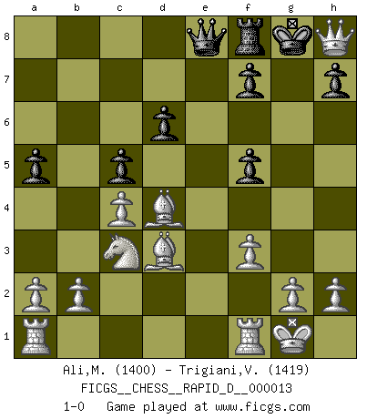 Last move : 1-0 2008 October 10 20:42:9 [Event "FICGS__CHESS__RAPID_D__000013"] [Site "FICGS"] [Date "2008.09.24"] [Round "1"] [White "Ali,Mohammad Wasif"] [Black "Trigiani,Vincenzo"] [Result "1-0"] [WhiteElo "1400"] [BlackElo "1419"] 1.c4 e5 2.Nc3 Nf6 3.Nf3 Bc5 4.Nxe5 Ng4 5.Nxg4 Nc6 6.e3 d6 7.d4 Bb4 8.d5 O-O 9.dxc6 Qe8 10.cxb7 Bf5 11.bxa8Q Qxa8 12.f3 g6 13.Nh6+ Kg7 14.Nxf5+ gxf5 15.Qd4+ Kg8 16.Bd3 Qe8 17.O-O Bc5 18.Qf4 Bxe3+ 19.Bxe3 a5 20.Qg5+ Kh8 21.Qf6+ Kg8 22.Bd4 c5 23.Qh8+ 1-0 English Opening Kingside Castling by player Black (move 8) Promotion Queen by player White (move 11) Kingside Castling by player White (move 17) Player White won this chess game. Follow this game move after move (download)What is the object of playing a gambit opening?... To acquire a reputation of being a dashing player at the cost of losing a game. (Siegbert Tarrasch) Schach ist gnadenlos. Du mußt bereit sein zu töten. (Nigel Short) Un jugador que es sorprendido, esta derrotado a medias. (Proverbio) Les pièces de l'échiquier étaient impitoyables. Elles le retenaient, elles l'absorbaient. Il y avait de l'horreur en cela, mais aussi une harmonie unique. Car, qu'y a-t-il dans le monde, à part les échecs ? (V. Nabokov) The ultimate in disposing one's troops is to be without ascertainable shape. Then the most penetrating spies cannot pry in nor can the wise lay plans against you. (Sun Tzu)