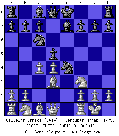 Last move : 1-0 2008 December 10 14:6:25 [Event "FICGS__CHESS__RAPID_D__000013"] [Site "FICGS"] [Date "2008.09.24"] [Round "1"] [White "Oliveira,Carlos"] [Black "Sengupta,Arnab"] [Result "1-0"] [WhiteElo "1414"] [BlackElo "1475"] 1.e4 e5 2.Nf3 Nf6 3.Nxe5 d6 4.Nf3 Nxe4 5.d4 d5 6.Bd3 Nc6 7.O-O Be7 8.c4 1-0 This chess game has been lost on time (started : 2008.09.24 5:59:52) Petrov : Classical attack Kingside Castling by player White (move 7) Player White won this chess game. Follow this game move after move (download)Different people feel differently about resigning. (Bobby Fischer) Ich habe die Schachforschung dermaßen betrieben, dass sie auf eine wissenschaftliche Basis gestellt wurde. (Mikhail Moiseyevich Botvinik) No hay precio que sea tan grande por la cabellera del Rey enemigo. (Koblentz) Il s'avisa de me proposer d'apprendre les échecs qu'il jouait un peu... me voilà forcené des échecs. J'achète un échiquier, je m'enferme dans ma chambre, j'y passe des jours et des nuits à vouloir apprendre par cur toutes les parties. (Jean-Jacques Rousseau, Confessions) A government big enough to give you everything you want is strong enough to take everything you have. (Thomas Jefferson)